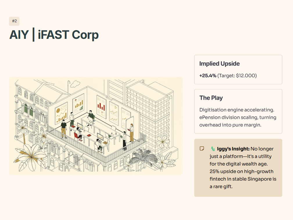 🦎 Iggy’s Insight: iFAST is no longer just a platform; it’s a utility for the digital wealth age. A 25% upside on a high-growth fintech in a stable market like Singapore is a rare gift.