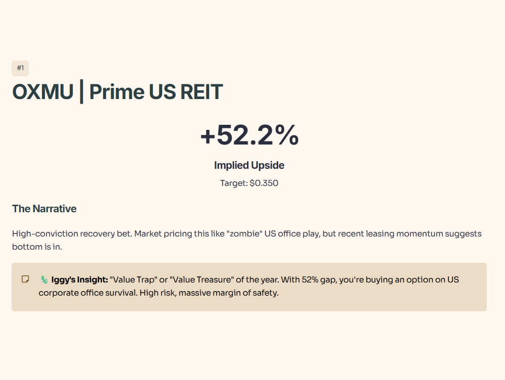 🦎 Iggy’s Insight: This is the “Value Trap” or “Value Treasure” of the year. With a 52% gap, you aren’t buying a stock; you’re buying an option on the survival of the US corporate office. High risk, but the margin of safety is massive at these levels.