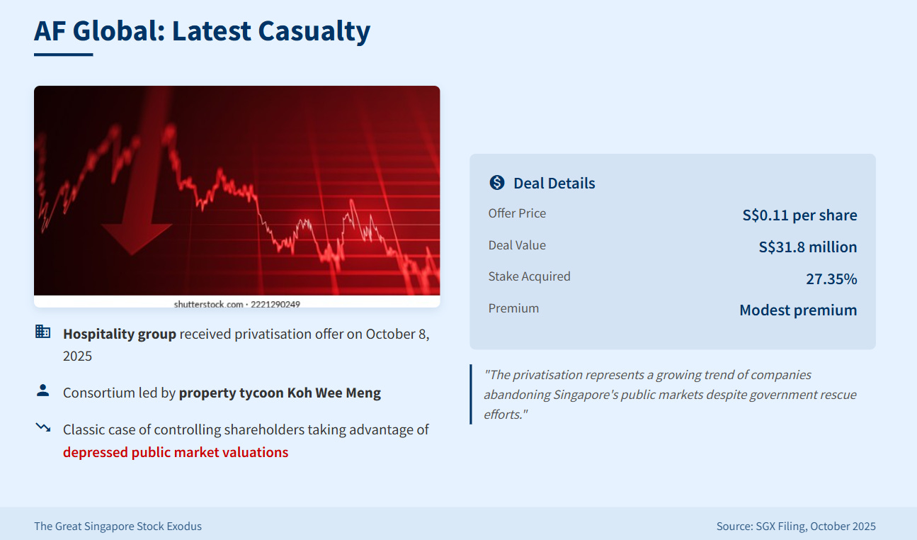 The most recent departures highlight why Singapore’s public markets have lost their appeal. AF Global, the hospitality group, received an 11-cent per share privatisation offer on October 8, 2025, from a consortium led by property tycoon Koh Wee Meng. The S$31.8 million deal values the company’s remaining 27.35% stake at a modest premium, but represents a classic case of controlling shareholders taking advantage of depressed public market valuations.​