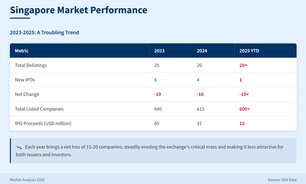 The table above reveals the devastating math behind Singapore’s market decline. Each year brings a net loss of 15-20 companies, steadily eroding the exchange’s critical mass and making it less attractive for both issuers and investors.​