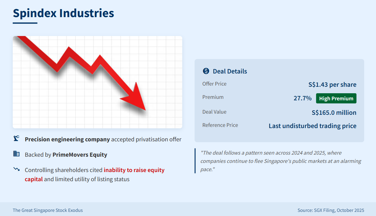 Similarly, Spindex Industries accepted a S$1.43 per share offer backed by PrimeMovers Equity, representing a 27.7% premium to its last undisturbed trading price. The precision engineering company’s controlling shareholders cited the inability to raise equity capital and limited utility of its listing status as key reasons for going private.​