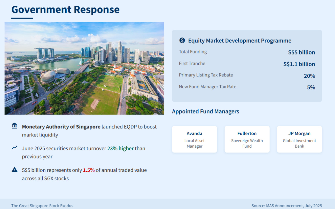 The Monetary Authority of Singapore’s S$5 billion EQDP represents the most ambitious attempt to revive the local stock market in decades. The programme allocates government funding to co-invest with asset managers specifically targeting small and mid-cap Singapore stocks, while offering tax incentives for new listings and fund managers.​