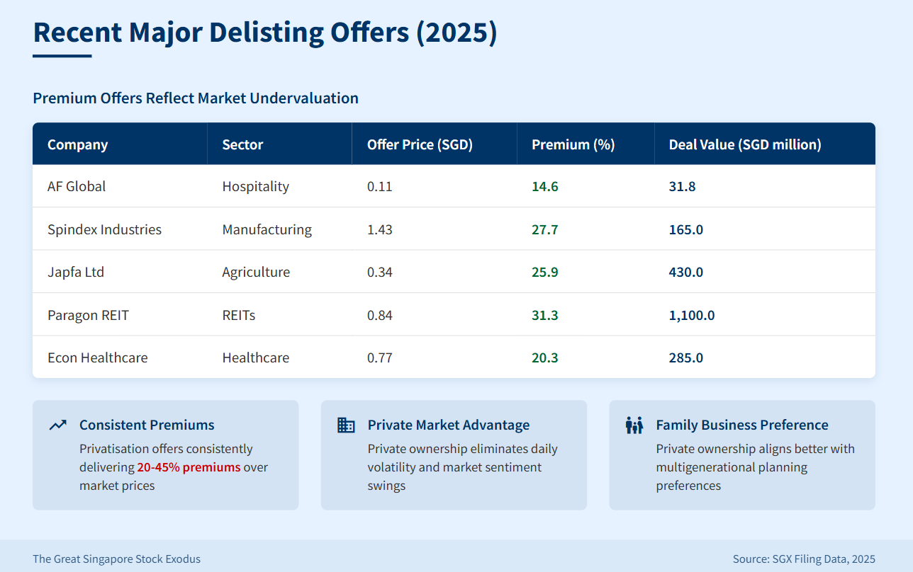 Recent privatisation offers have consistently delivered premiums of 20-45% over market prices. AF Global’s 11-cent offer represents a 14.6% premium, while Spindex’s S$1.43 offer came at a 27.7% premium. These premiums reflect the discount at which public markets value Singapore companies.​