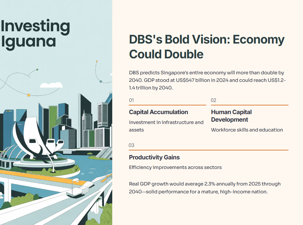 The numbers look ambitious. Singapore’s GDP stood at US$547 billion in 2024. DBS forecasts it will reach between US$1.2 trillion and US$1.4 trillion by 2040. That growth would be driven by three main engines: capital accumulation, human capital development, and productivity gains.