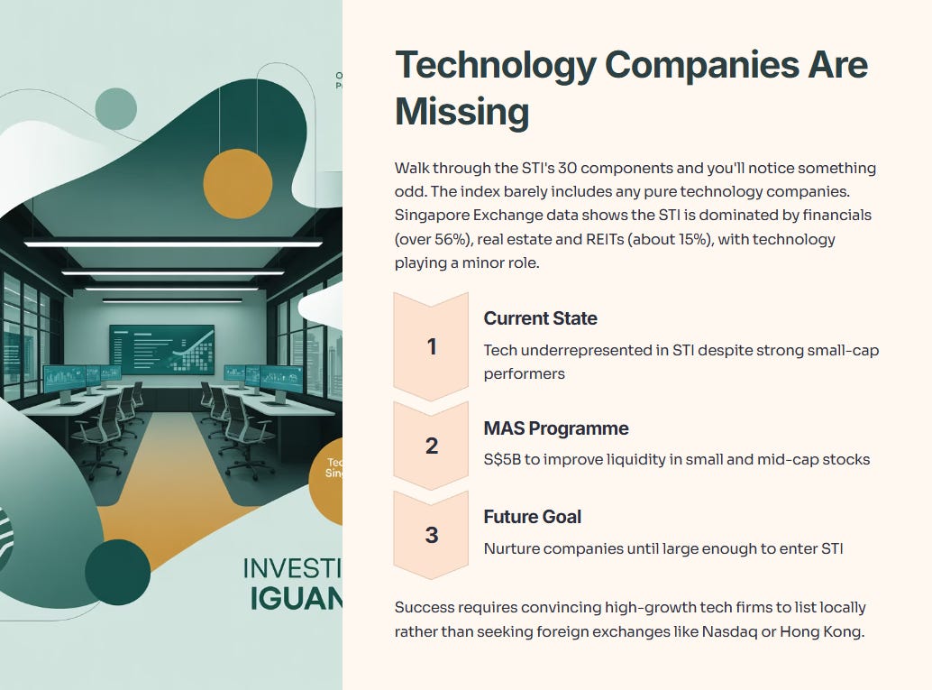Walk through the STI’s 30 components and you’ll notice something odd. The index barely includes any pure technology companies.