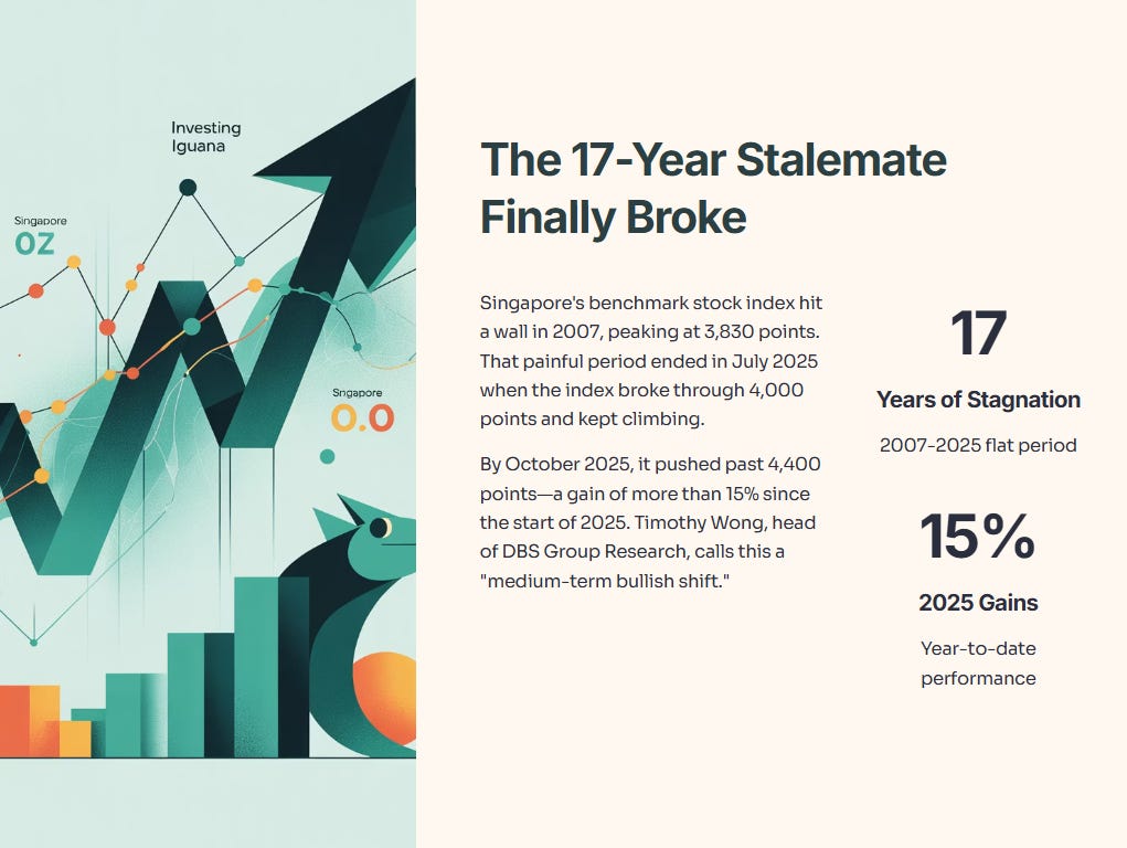 The STI has gained more than 15% since the start of 2025. That performance stands out, especially when you compare it to the previous 17 years of stagnation.
