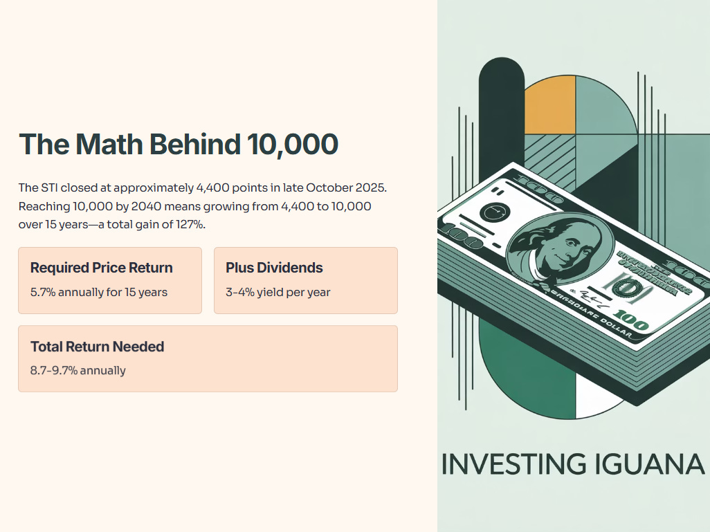 The STI closed at approximately 4,400 points in late October 2025. Reaching 10,000 points by 2040 means the index must grow from 4,400 to 10,000 over 15 years. That represents a total gain of 127%.