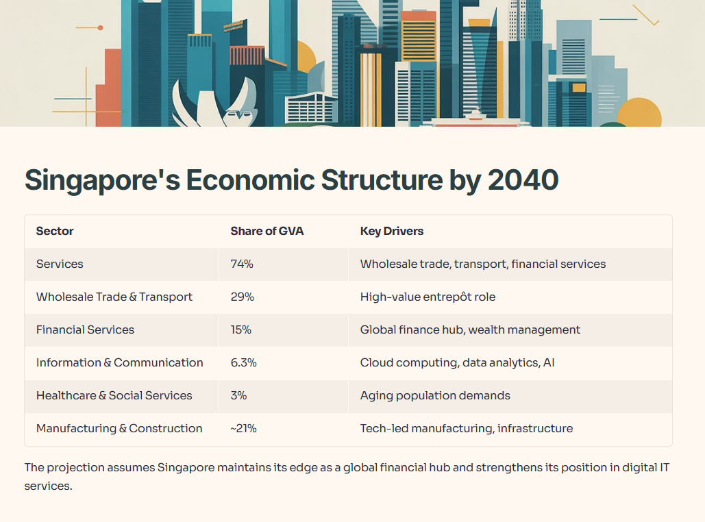 The projection assumes Singapore maintains its edge as a global financial hub, strengthens its position in digital IT services, and expands its care economy to serve an aging population.
