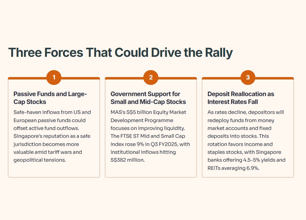 Timothy Wong, head of DBS Group Research, calls this a “medium-term bullish shift.” He points to several factors: fading US exceptionalism, Singapore’s safe-haven appeal, attractive valuations, low domestic interest rates, and support from the Monetary Authority of Singapore.