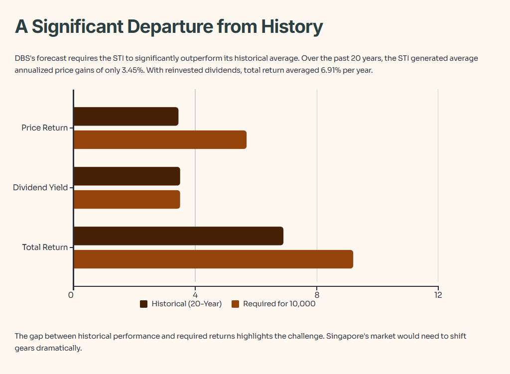 The gap between historical performance and required returns highlights the challenge. Singapore’s market would need to shift gears dramatically.