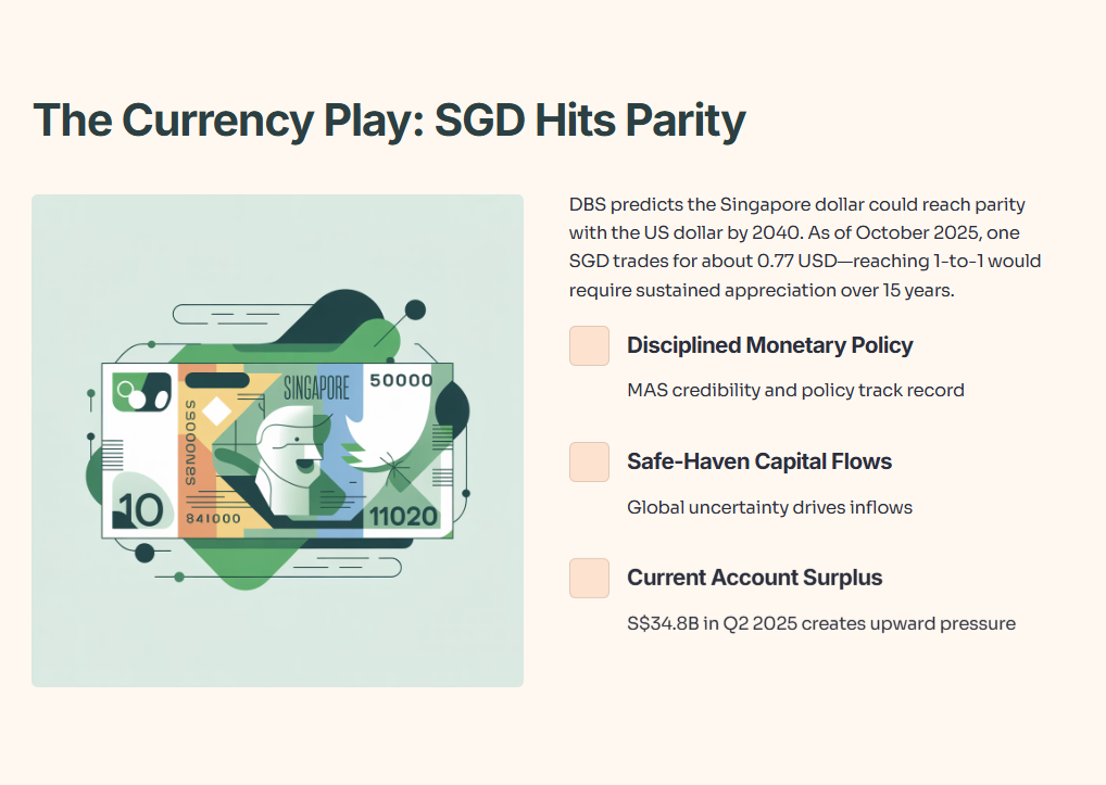 That would be a massive shift. As of October 2025, one Singapore dollar trades for about 0.77 US dollars. Reaching 1-to-1 parity would require sustained appreciation over 15 years.