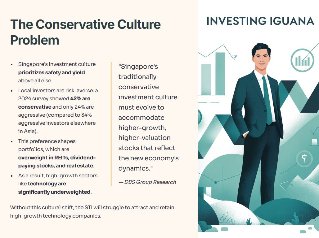 Singapore’s investment culture leans heavily toward safety and yield. That conservative approach has served investors well in many ways. But it also creates obstacles for the market’s growth.