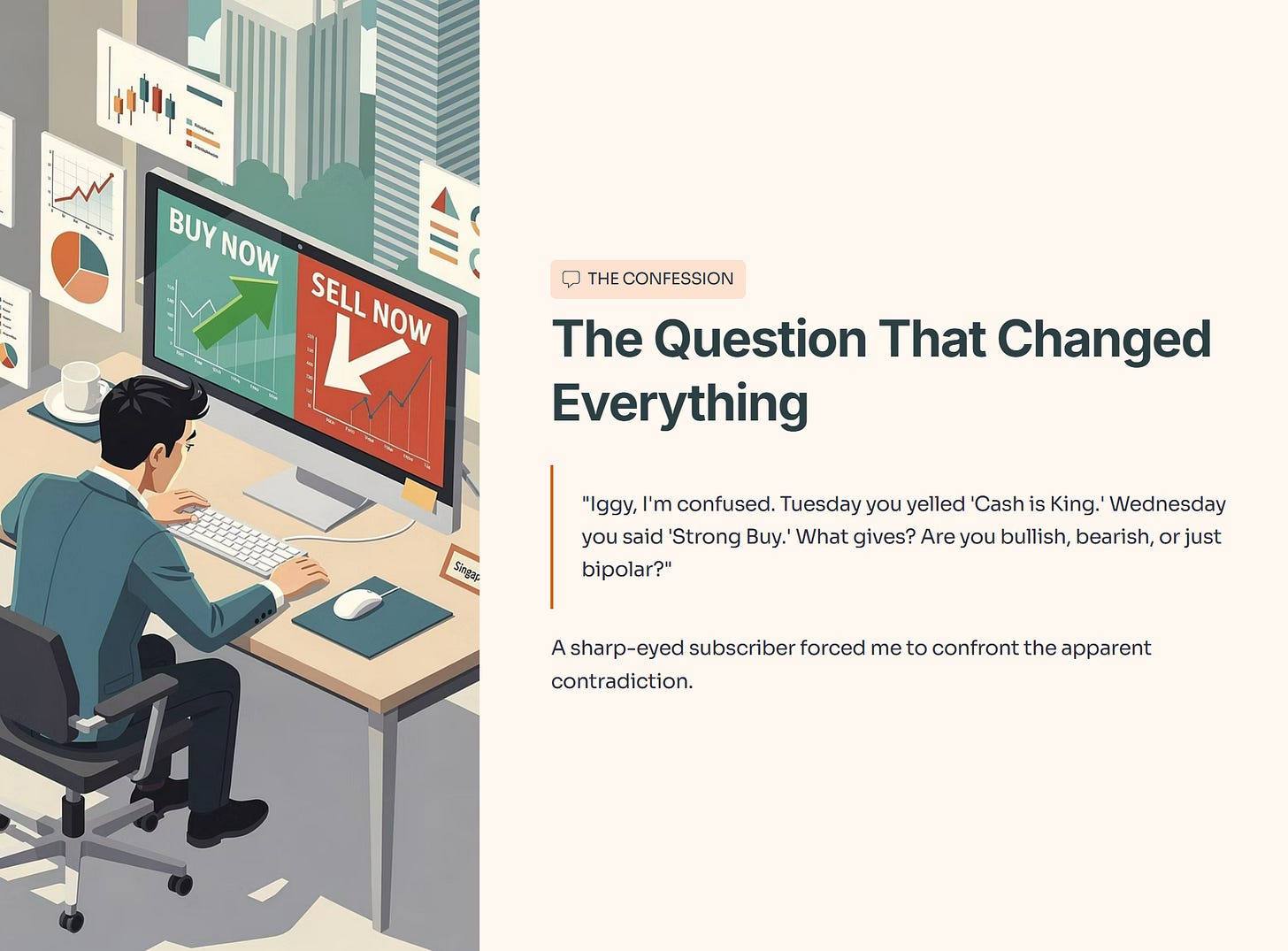 “Iggy, I’m confused. On Tuesday, you wrote a piece about the danger in global markets and practically yelled ‘Cash is King.’ Then on Wednesday, you sent out a deep dive on a local bank saying it was a ‘Strong Buy.’ What gives? Are you bullish, bearish, or just bipolar?”