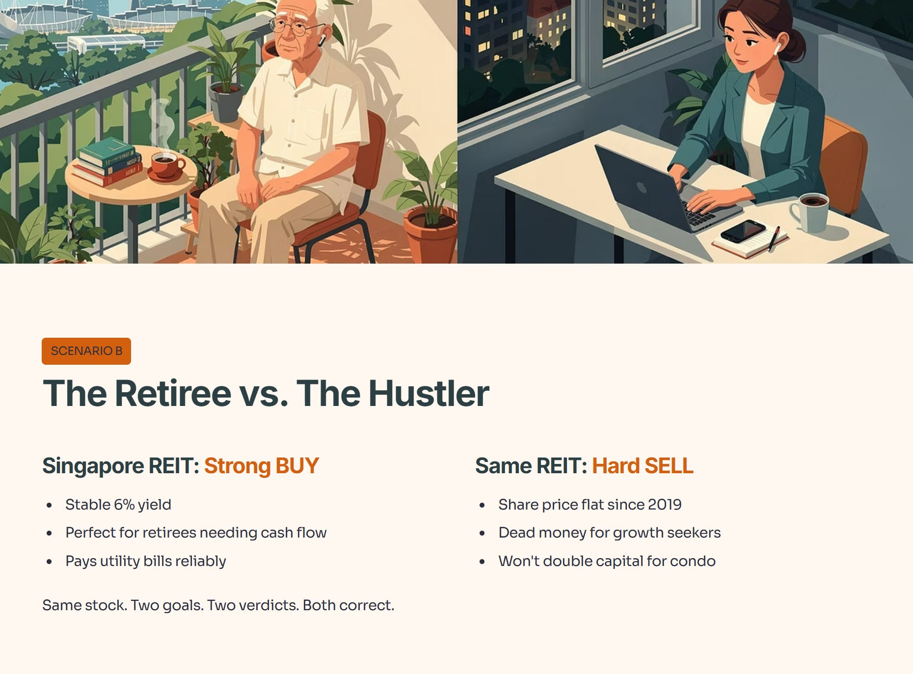 Why? Because that REIT’s share price hasn’t moved since 2019. If you are trying to double your capital to buy a condo, that REIT is a trap. It is “dead money.”