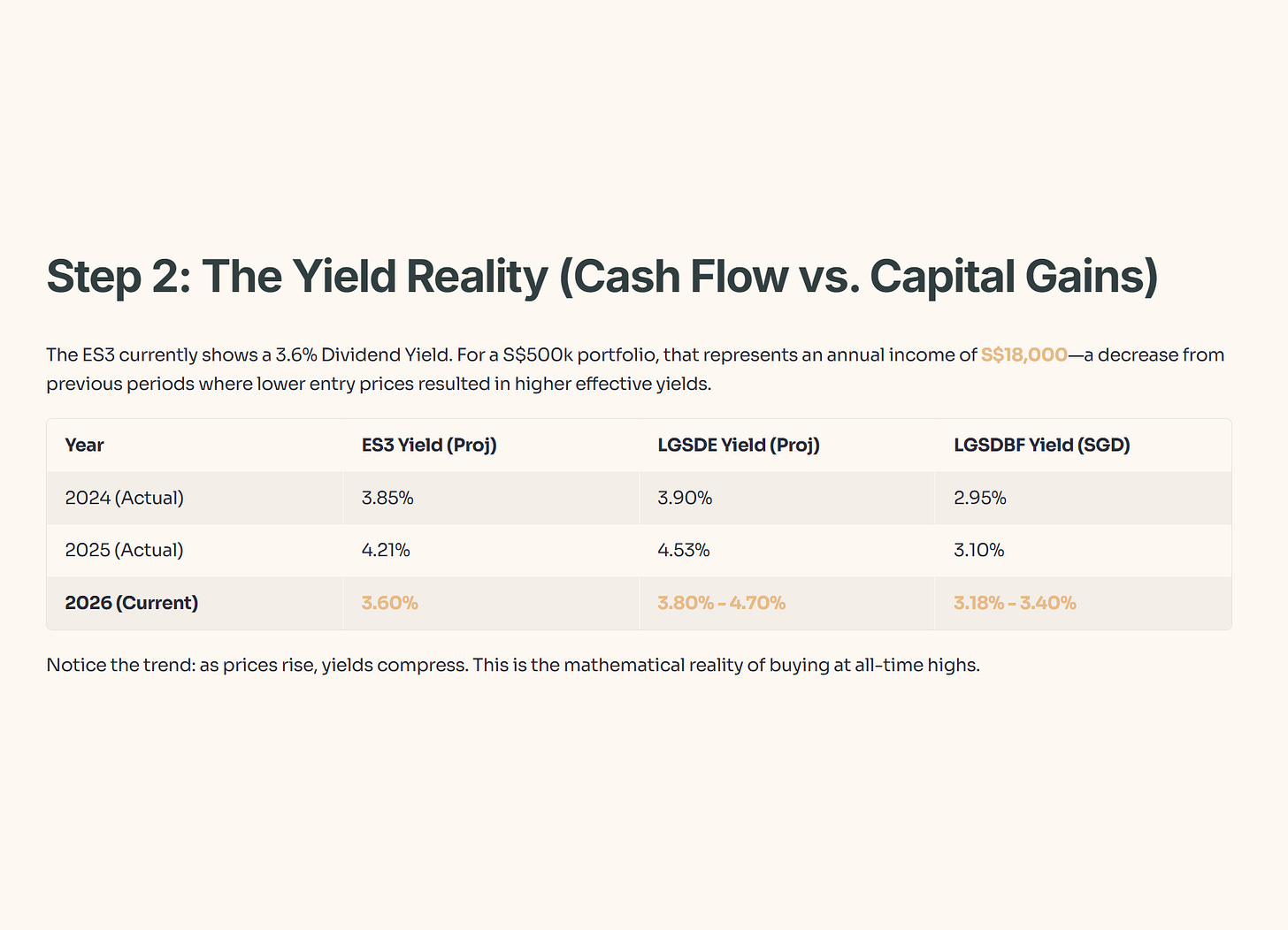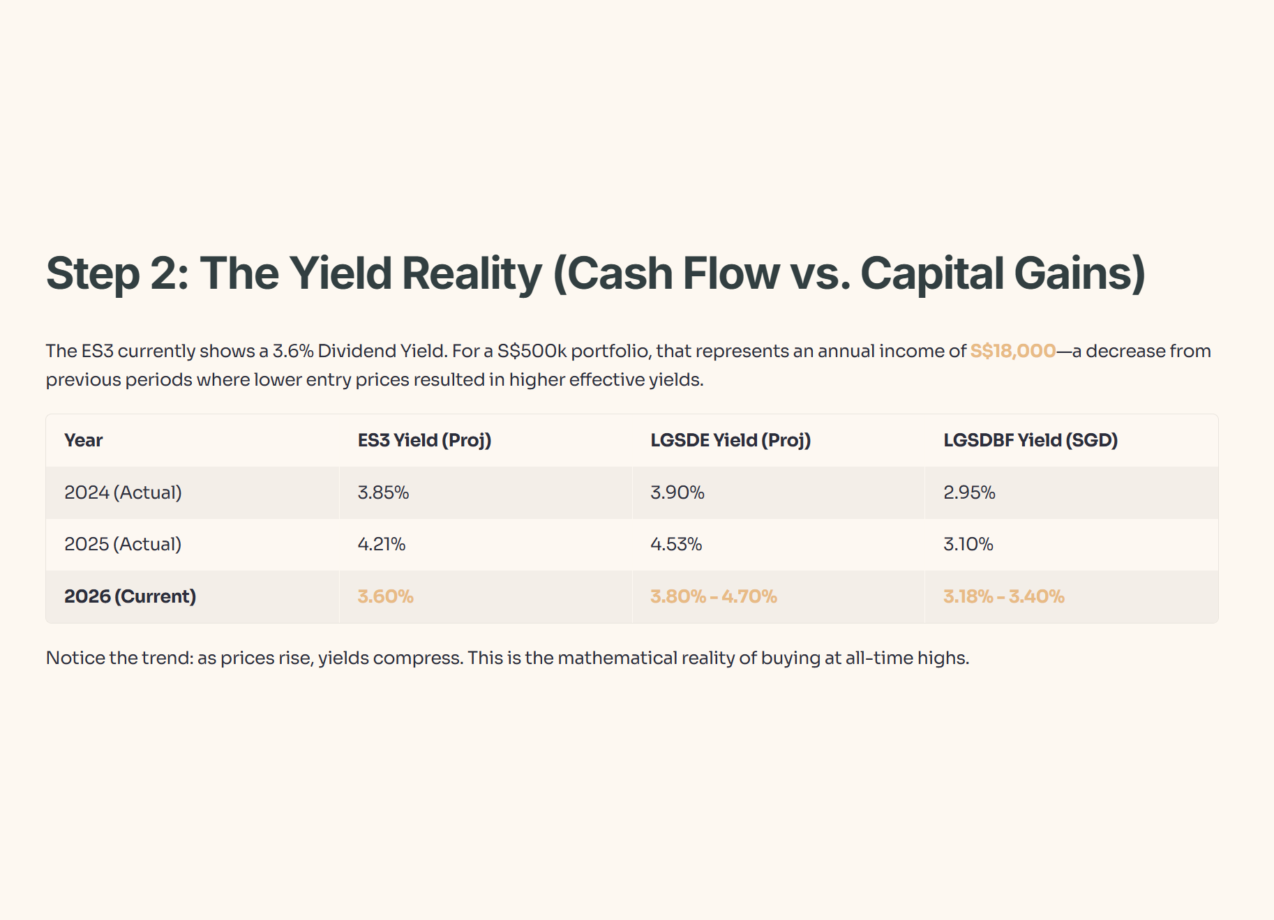 As of early Feb 2026, the ES3 shows a dividend yield of around 3.6%. For a S$500k portfolio, that represents an annual income of S$18,000—a decrease from previous periods where lower entry prices resulted in higher effective yields.