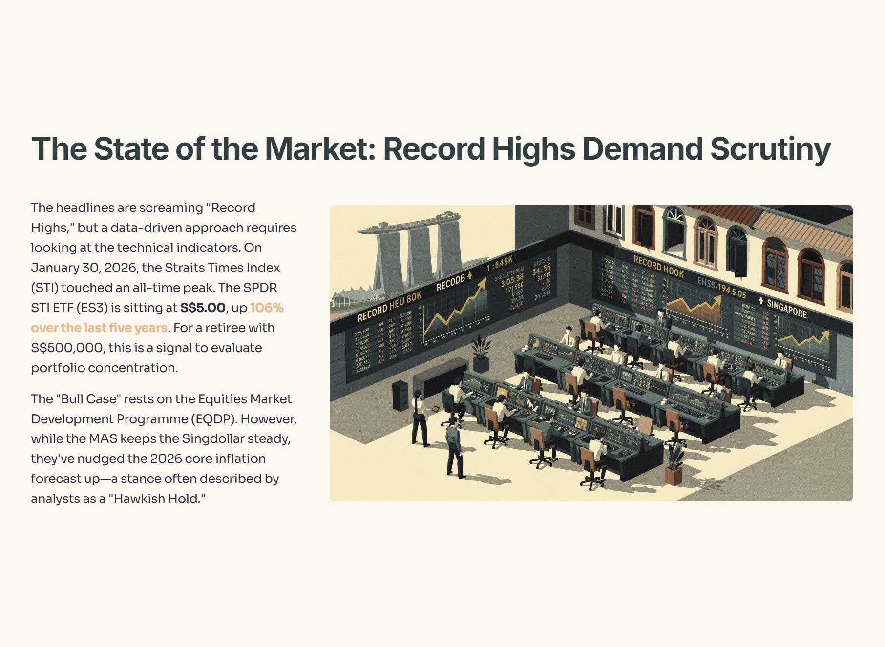 The headlines are screaming “Record Highs,” but a data-driven approach requires looking at the technical indicators. On January 30, 2026, the Straits Times Index (STI) touched an all-time peak. As of that date, the SPDR STI ETF (ES3) was trading around S$5.00 and has roughly doubled over the last five years. For a retiree with S$500,000, this is a signal to evaluate portfolio concentration.
