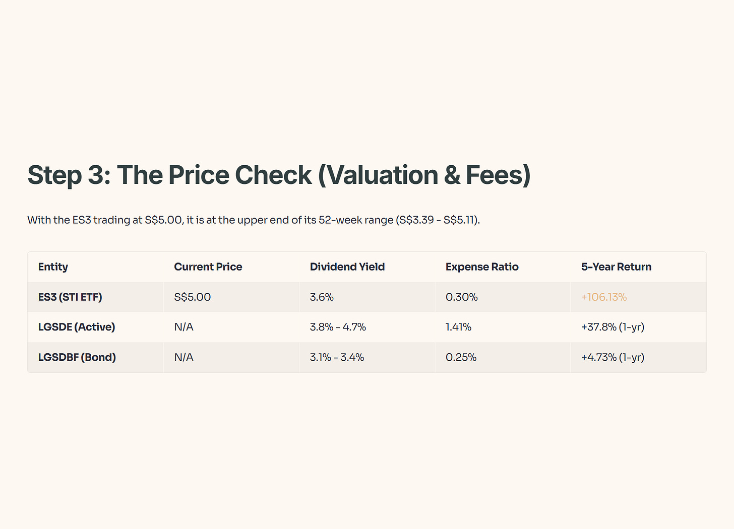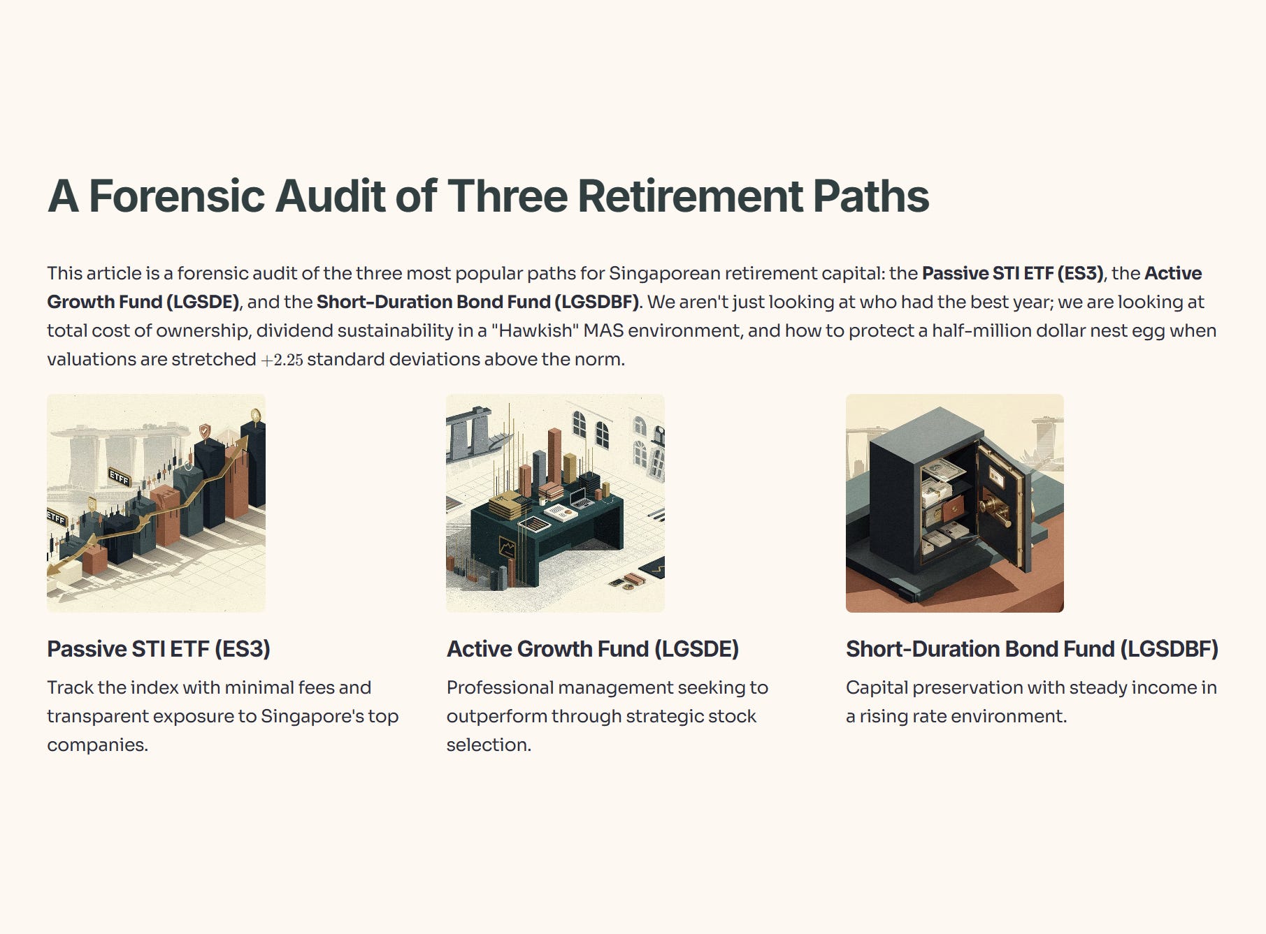 This article is a forensic audit of the three most popular paths for Singaporean retirement capital: the Passive STI ETF (ES3), the Active Growth Fund (LGSDE), and the Short-Duration Bond Fund (LGSDBF). We aren’t just looking at who had the best year; we are looking at total cost of ownership, dividend sustainability in a “Hawkish” MAS environment, and how to protect a half-million dollar nest egg when valuations are trading well above their historical average (previously estimated at about 2.25 standard deviations above the norm).