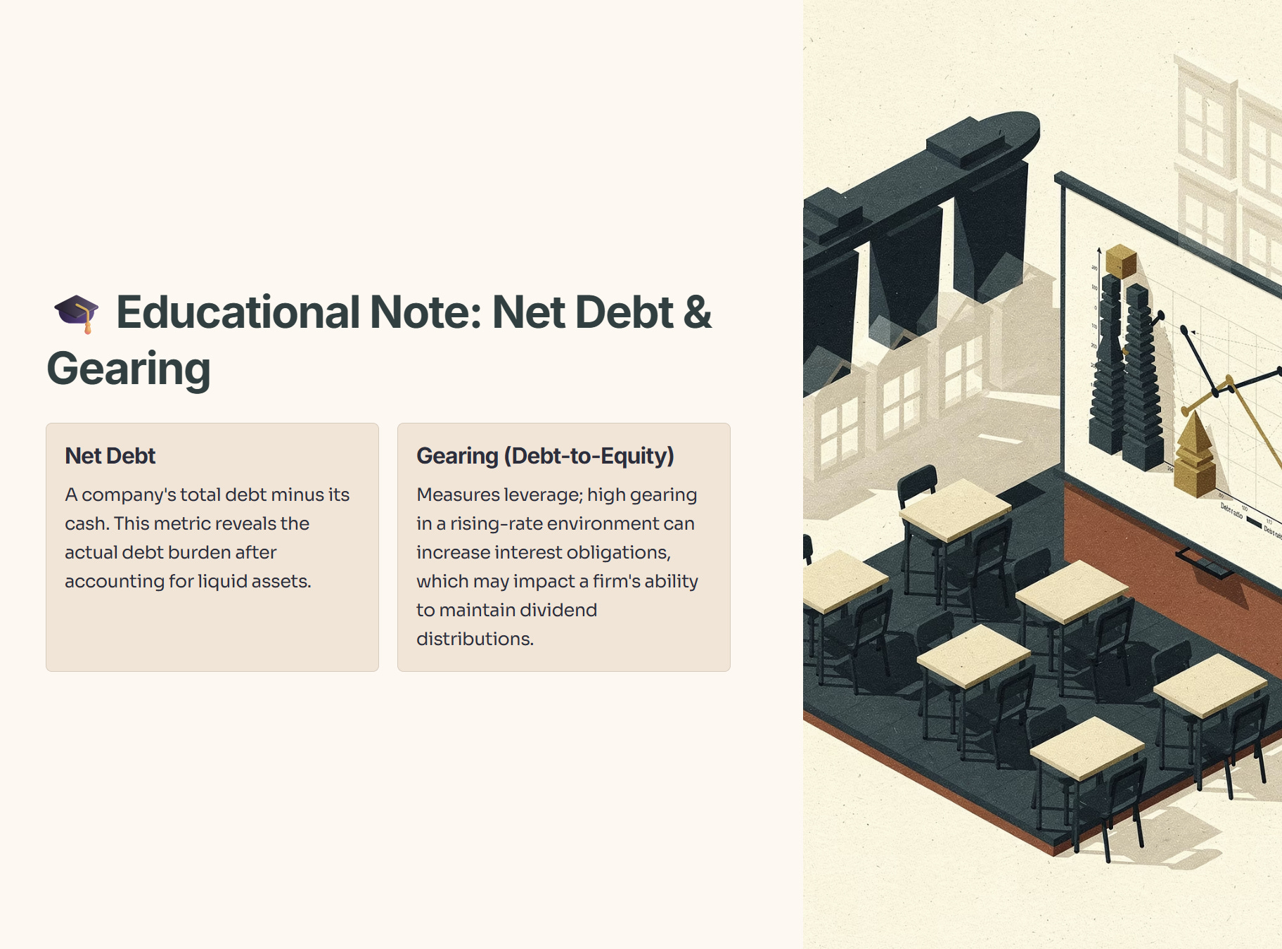 Net Debt is a company’s total debt minus its cash. Gearing (Debt-to-Equity) measures leverage; high gearing in a rising-rate environment can increase interest obligations, which may impact a firm’s ability to maintain dividend distributions.