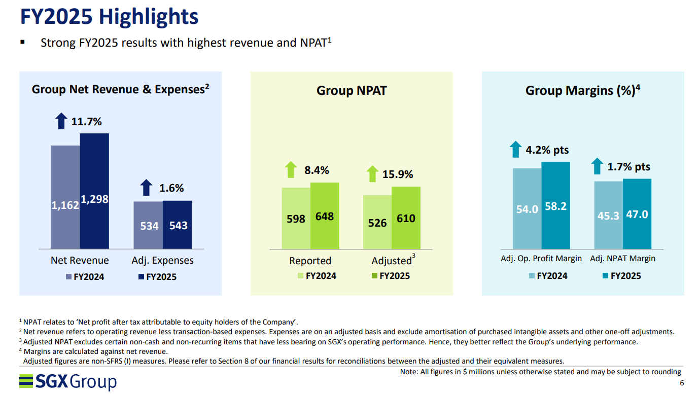 SGX delivered its highest net revenue and NPAT. Net revenue rose 11.7% to S$1,298m. Adjusted expenses grew just 1.6% to S$543m. Operating leverage did the heavy lifting