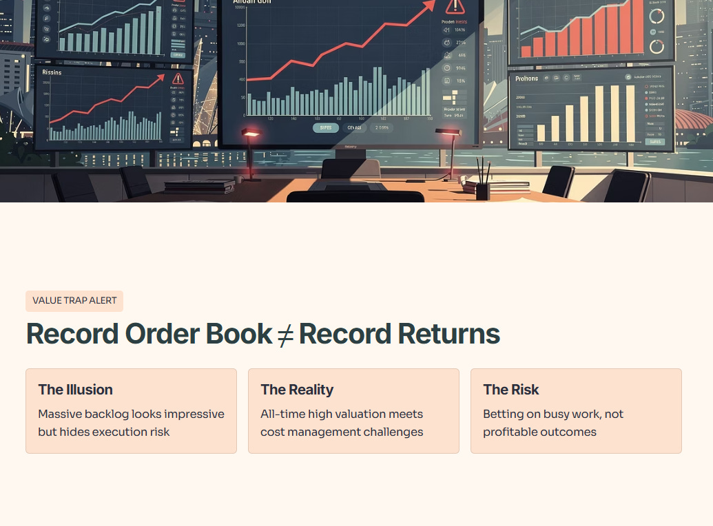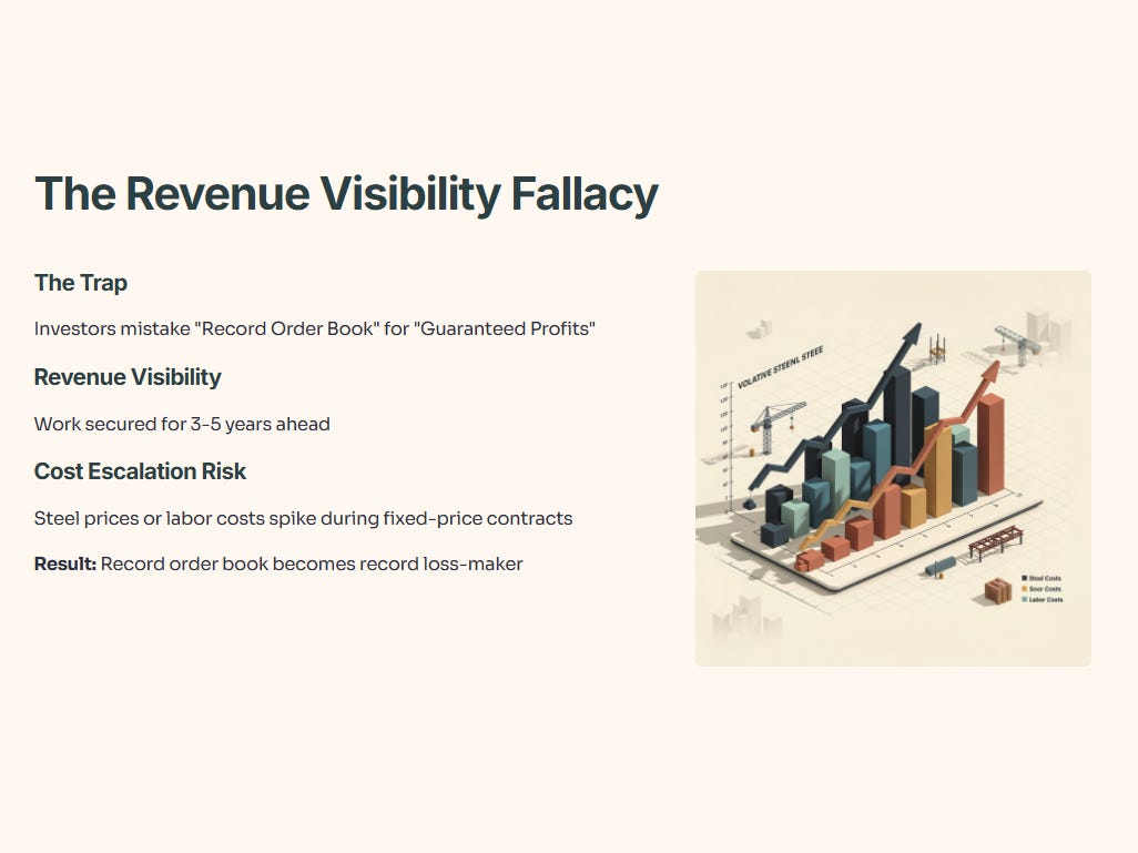 Investors often mistake a “Record Order Book” for “Guaranteed Profits.” In heavy engineering, this is known as Revenue Visibility. While it tells you the company has work for the next 3-5 years, it doesn’t account for Cost Escalation Risk. If steel prices or labor costs spike while a company is locked into a fixed-price 5-year contract, that “record order book” becomes a record loss-maker.
