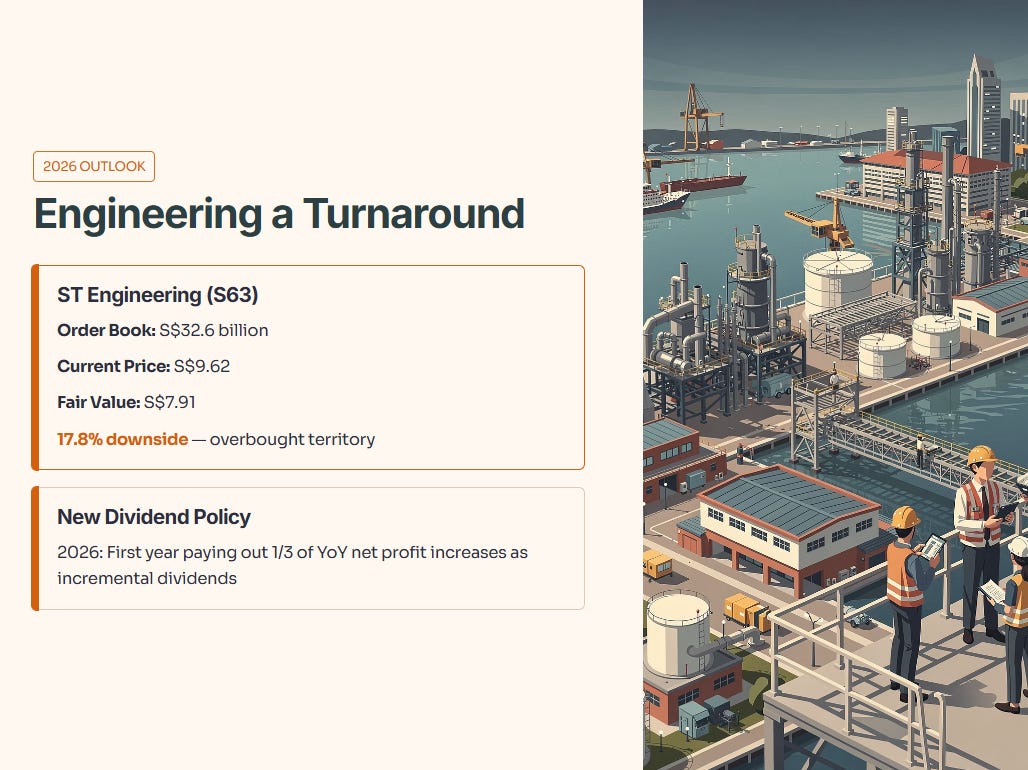ST Engineering (SGX: S63) is hitting resistance. While its S$32.6 billion order book is impressive, the stock is currently in overbought territory. Its InvestingPro Fair Value sits at S$7.91, suggesting a 17.8% downside from the current price of S$9.62. 2026 will be the first year of its new dividend policy—paying out a third of year-on-year net profit increases as incremental dividends.