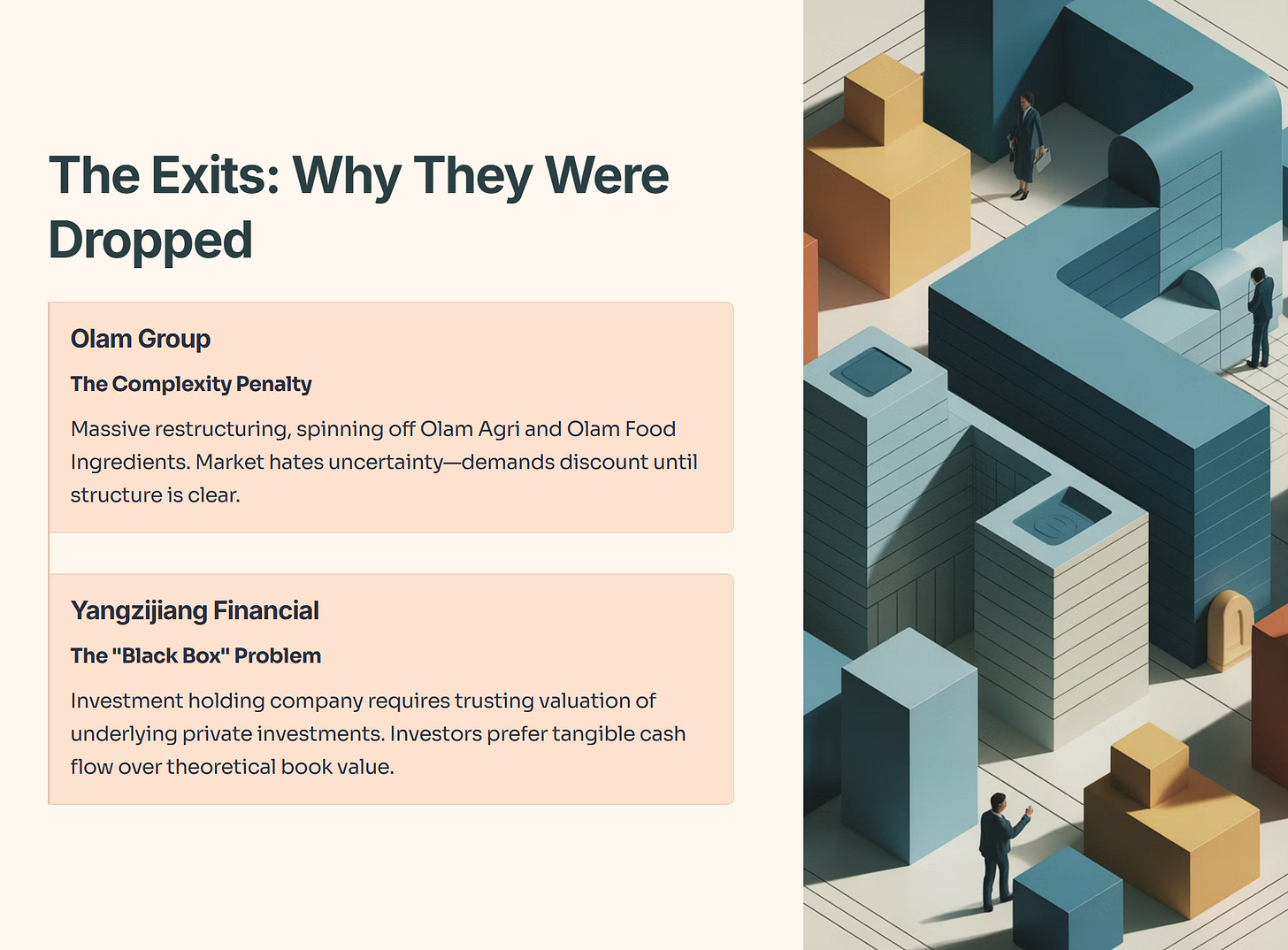 1. Olam Group: The complexity penalty. Olam is undergoing massive restructuring, spinning off Olam Agri and Olam Food Ingredients. The market hates uncertainty. Until the corporate structure is crystal clear, institutional capital demands a discount.