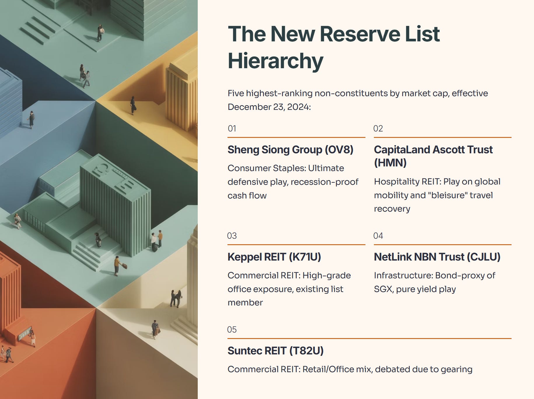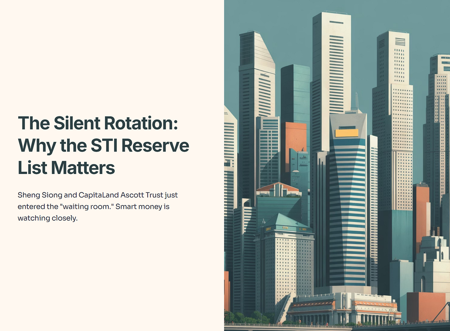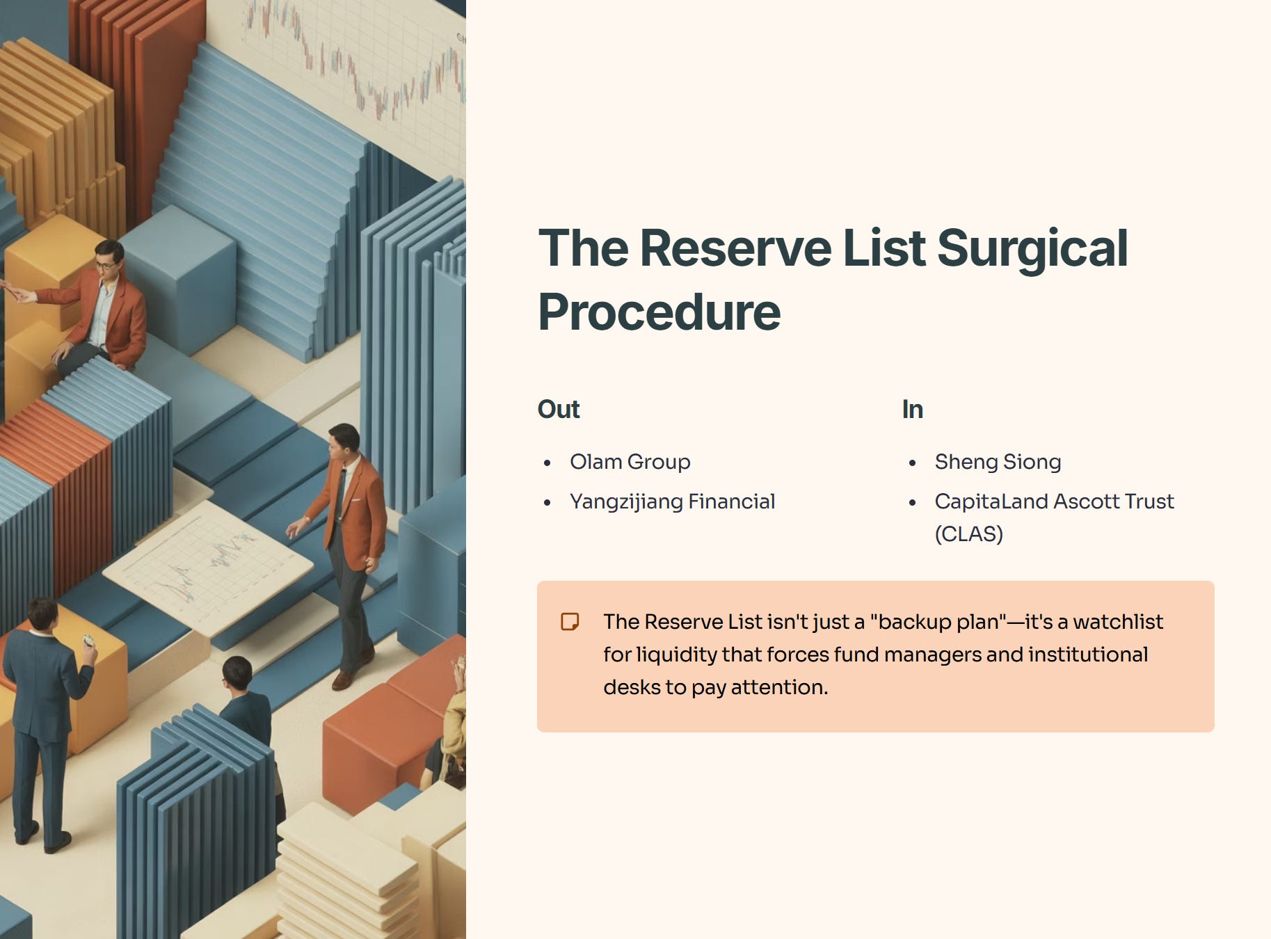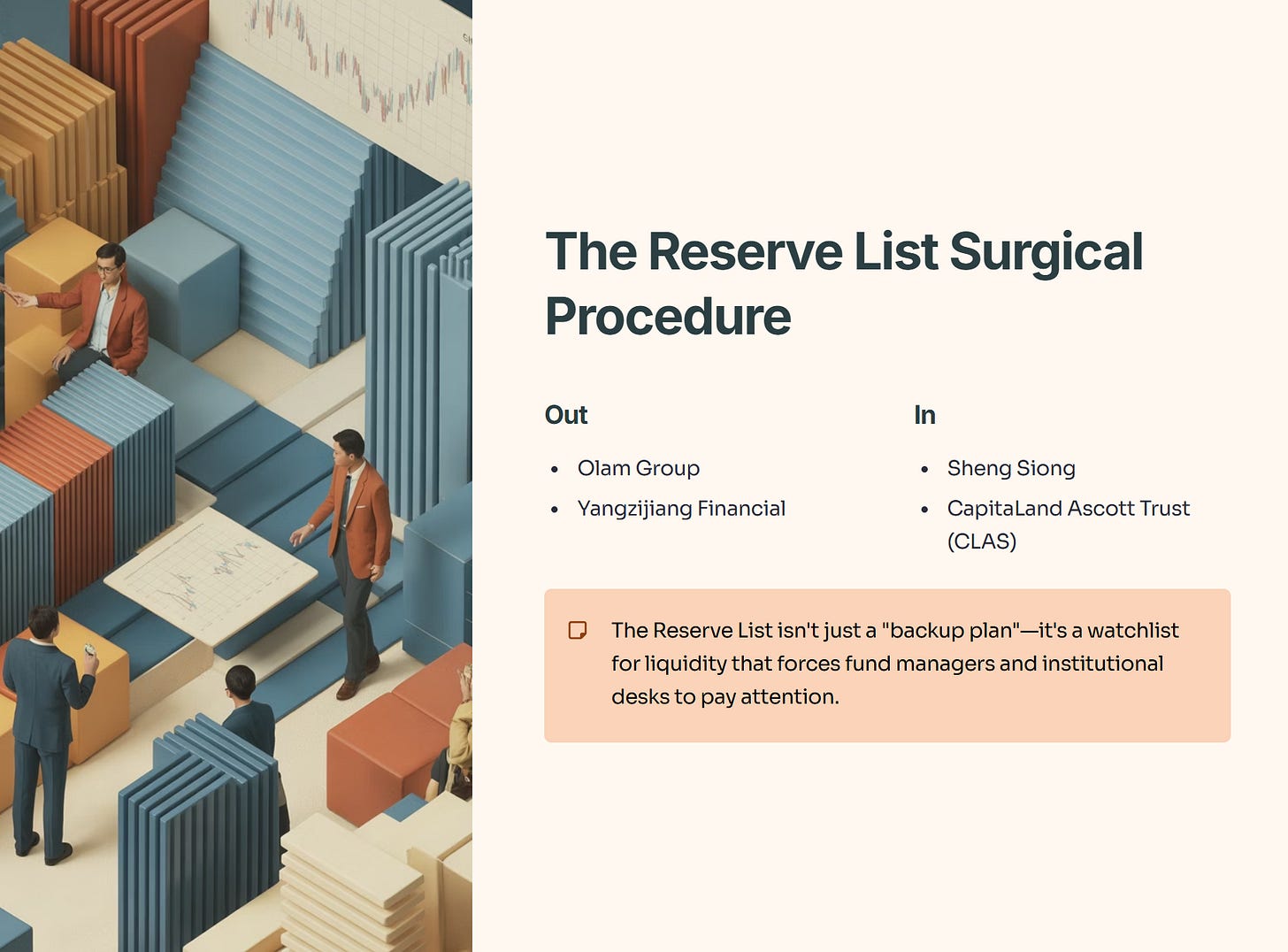 While the main index stood still, the Reserve List—the exclusive five-stock waiting room for the STI—underwent a significant surgical procedure. Olam Group and Yangzijiang Financial were cut. Sheng Siong and CapitaLand Ascott Trust (CLAS) were drafted in.