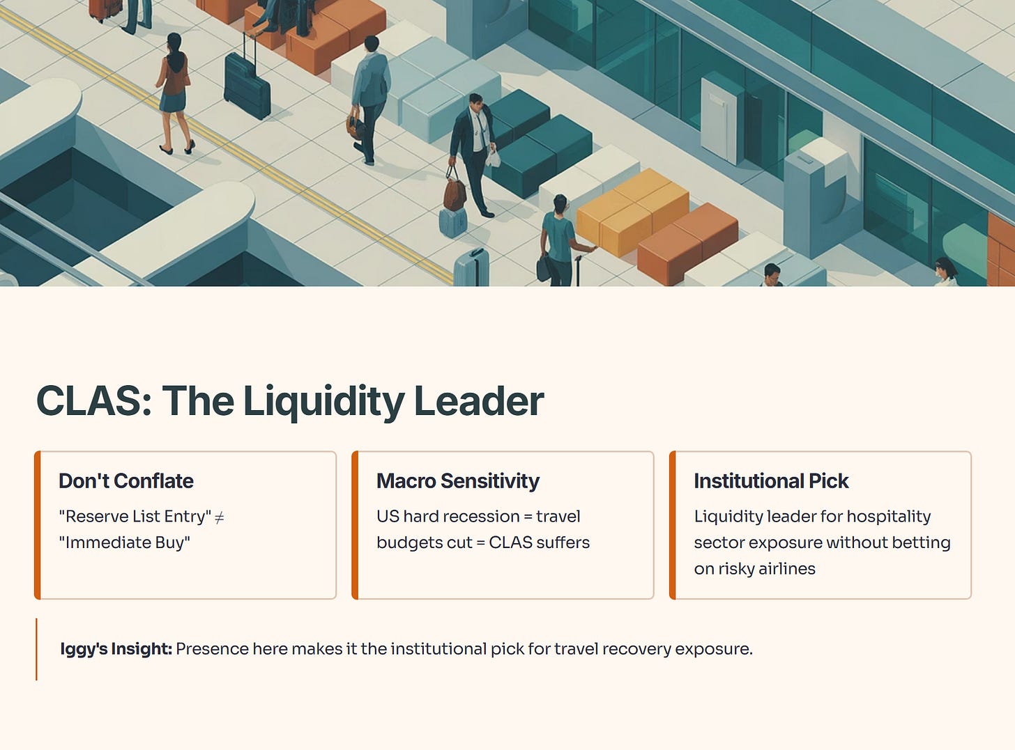 Don’t conflate “Reserve List Entry” with “Immediate Buy.” CLAS is sensitive to global macroeconomics. If the US goes into a hard recession, travel budgets get cut, and CLAS suffers. However, its presence here makes it the liquidity leader for the hospitality sector. If you want exposure to travel recovery without betting on a risky airline, this is the institutional pick.