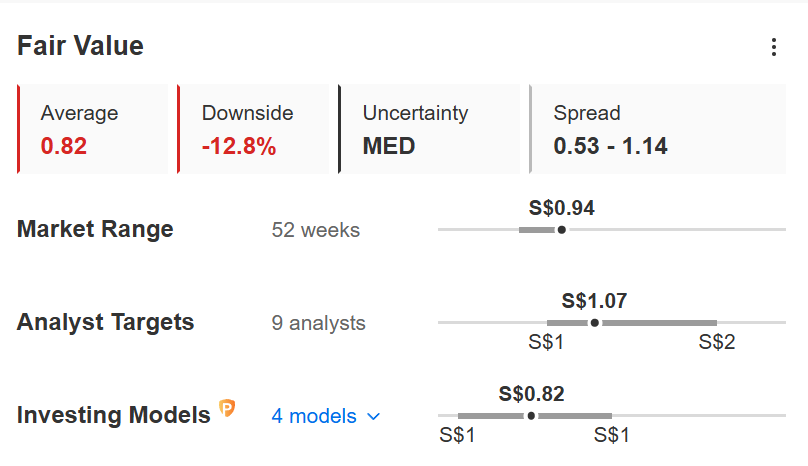 Who is right? The stock is currently trading at S$0.94. That means if you buy today, you are paying a premium against the model’s fair value. The math suggests a -12.8% downside.