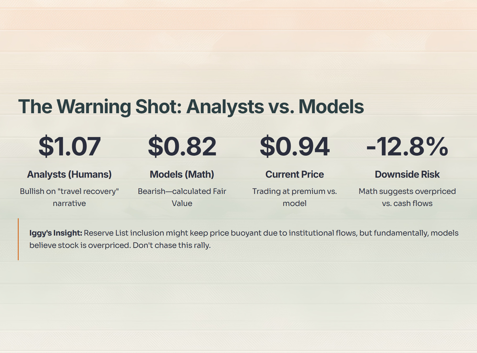 The Reserve List inclusion might keep the price buoyant for a while due to institutional flows, but fundamentally, the models believe the stock is overpriced relative to its cash flows. Do not chase this rally.