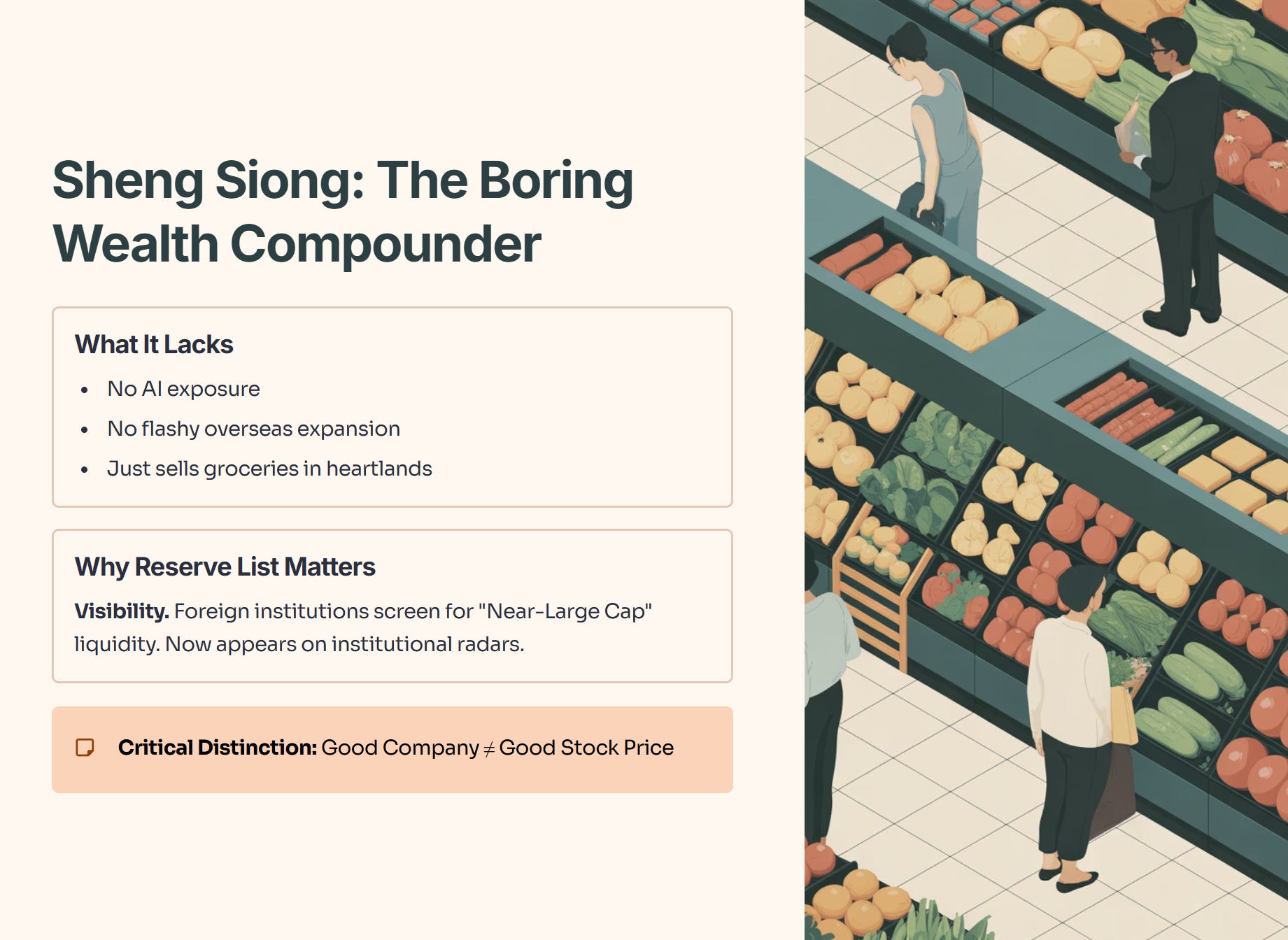 Sheng Siong entering the reserve list is a validation of its “slow and steady” approach. But investors need to be careful: Good Company ≠ Good Stock Price.