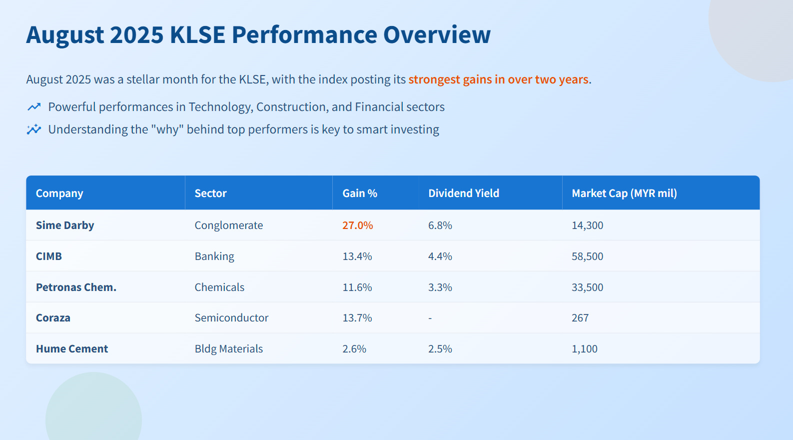 August 2025 saw the KLCI surge, driven by powerful performances in the Technology, Construction, and Financial sectors. Let's look at the individual stories behind the numbers.