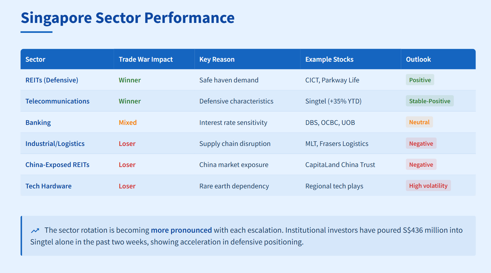 REITs have emerged as the clear winners, with institutional investors pouring S$436 million into Singtel alone in the past two weeks. This compares to S$297 million for the entire first quarter, showing the acceleration in defensive positioning.