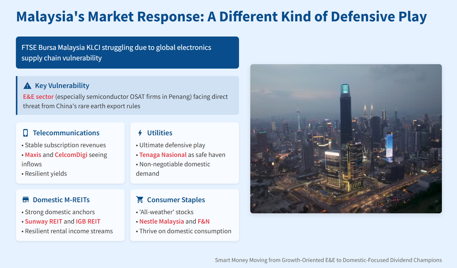 The key takeaway for Malaysian investors is clear: the trade war is no longer an abstract concept. It poses a direct threat to the country’s key economic engine. The smart money is moving from the growth-oriented E&E sector to domestic-focused dividend champions.