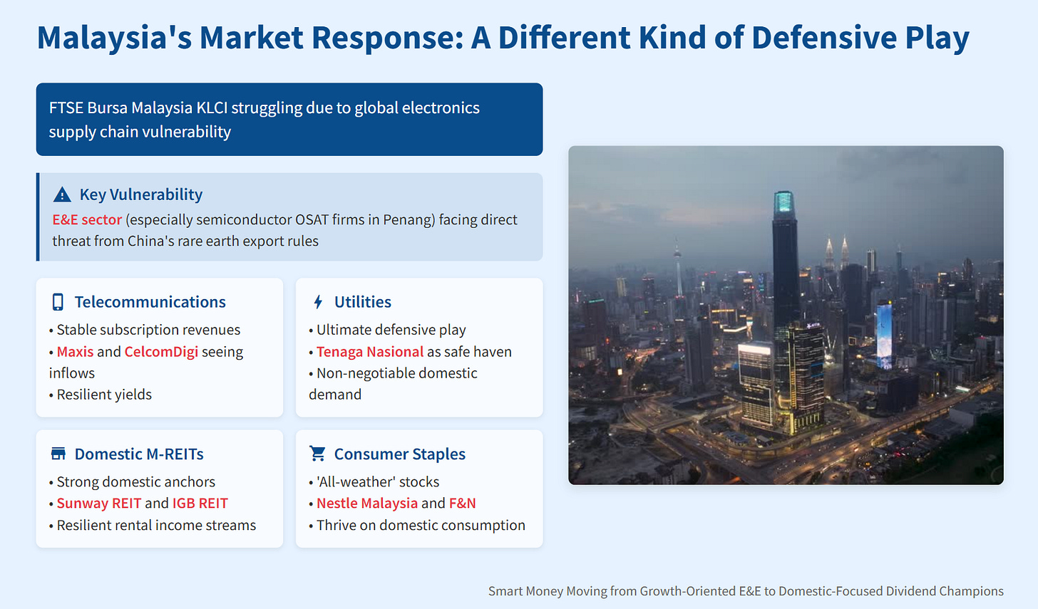 As a result, Malaysian investors are mirroring their Singaporean counterparts by rotating into classic defensive sectors known for stable cash flow and domestic demand, which are insulated from this global supply chain chaos: