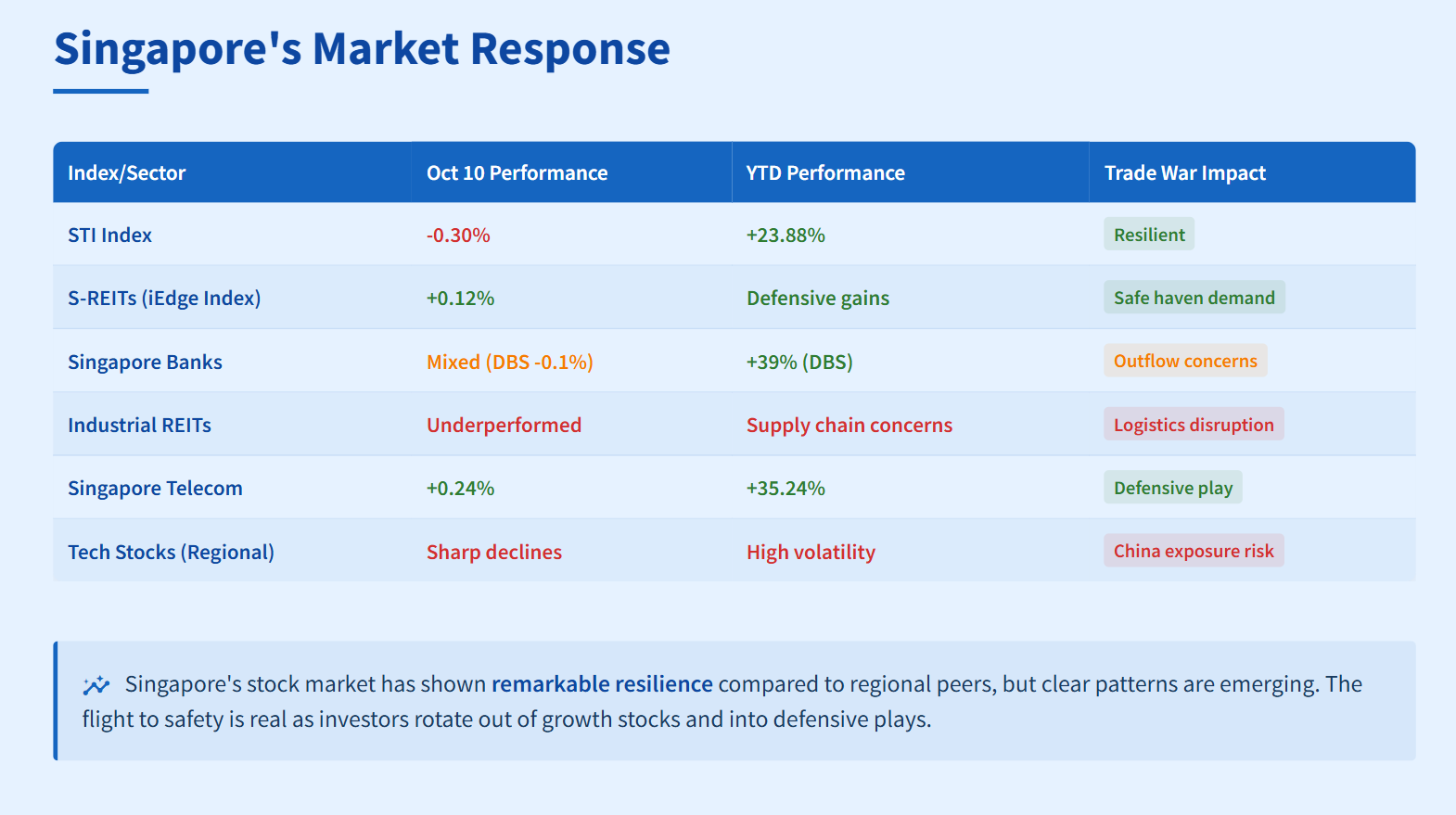 The flight to safety is real. Investors are rotating out of growth stocks and into defensive plays. Singtel has surged 35% this year as investors seek stable dividend yields in uncertain times. Meanwhile, industrial REITs face headwinds as supply chain disruptions threaten logistics demand.