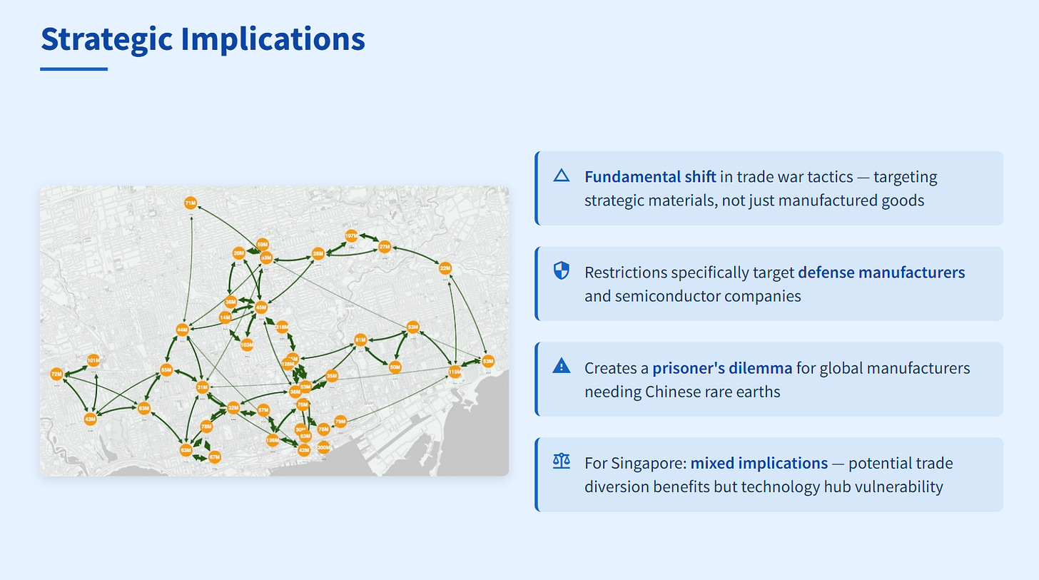 The rare earth issue also highlights Singapore’s vulnerability as a technology hub. Many of Singapore’s key industries - from semiconductors to renewable energy - depend on Chinese rare earth supplies. Any disruption could cascade through Singapore’s economy.