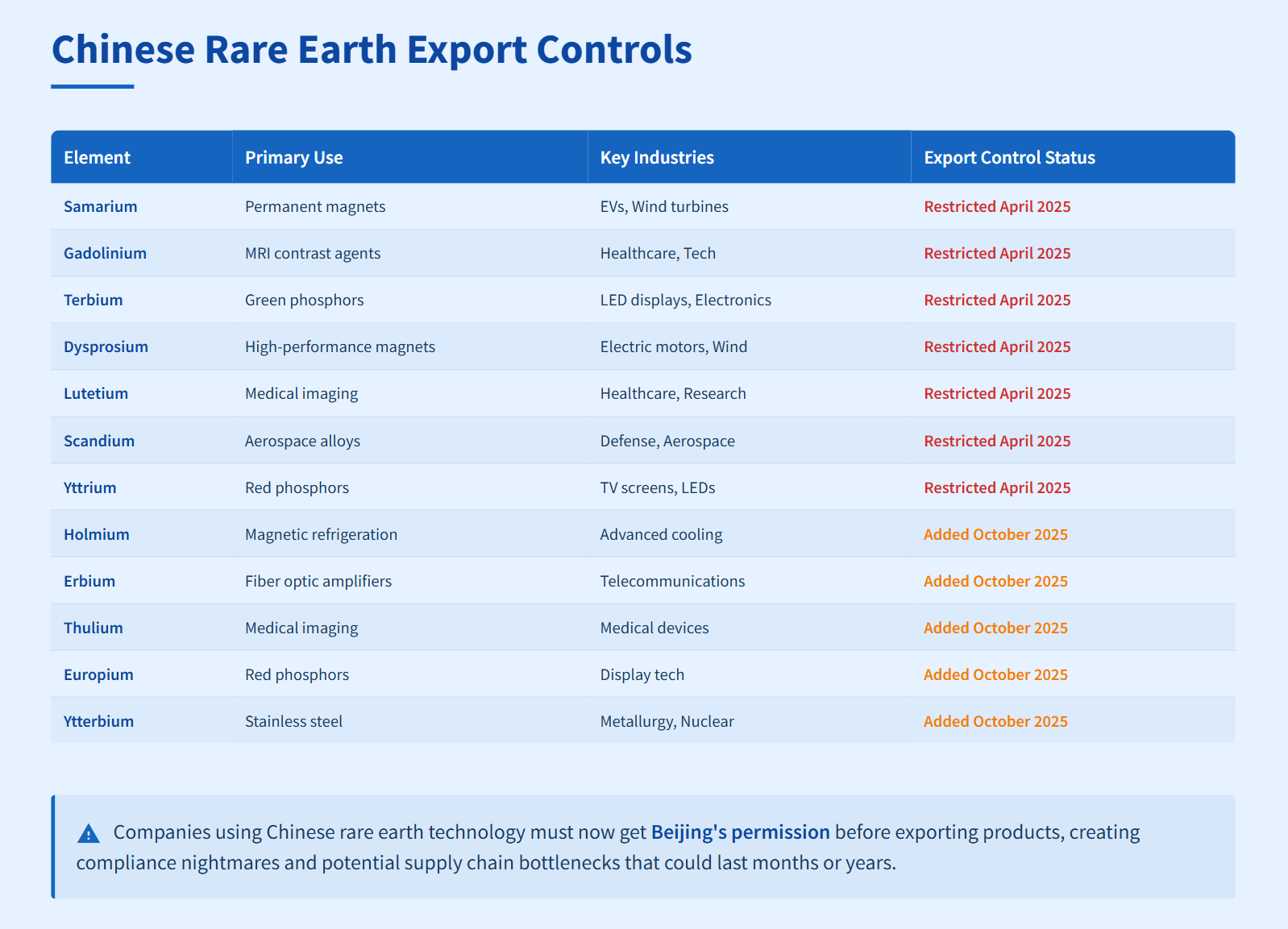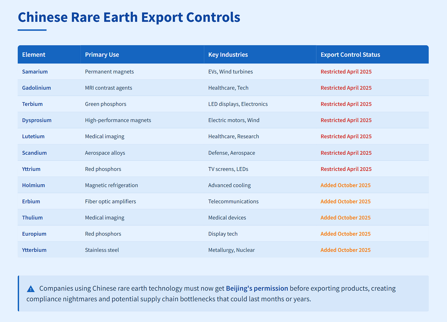 The new export controls target 12 of the 17 known rare earth elements. China started with seven in April and just added five more in October. Each element serves critical functions across multiple industries.