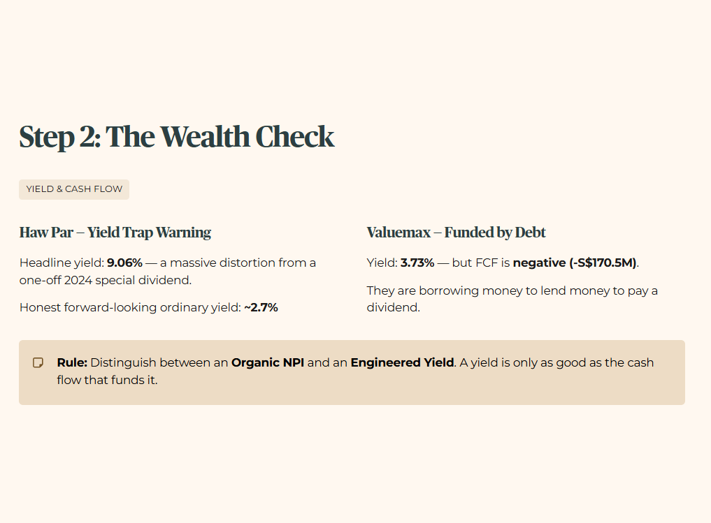 We must distinguish between an Organic NPI and an Engineered Yield. A yield is only as good as the cash flow that funds it. Retail headlines will scream about Haw Parâs trailing 9.06% dividend yield. Ignore it. That figure is a massive distortion caused by a one-off special dividend in 2024. If you buy based on that headline, you are walking straight into a Yield Trap. The honest, forward-looking ordinary yield is roughly 2.7%.