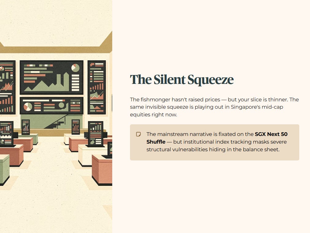 You feel it at the wet market every Sunday morning. The fishmonger hasnât changed the price of the sea bass, but the slice you get in the bag is undeniably thinner. That silent, invisible squeeze on your purchasing power is the exact same dynamic playing out in the Singapore stock market right now. And letâs be honest, the mainstream narrative is currently fixated on the shiny momentum of mid-cap equities, driven entirely by the highly publicised âSGX Next 50 Shuffleâ. But here is the uncomfortable truth: institutional index tracking creates a forced buying mechanism that often masks severe structural vulnerabilities hiding deep in the balance sheet. Welcome to the latest zero-day forensic report for our Elite Investors.