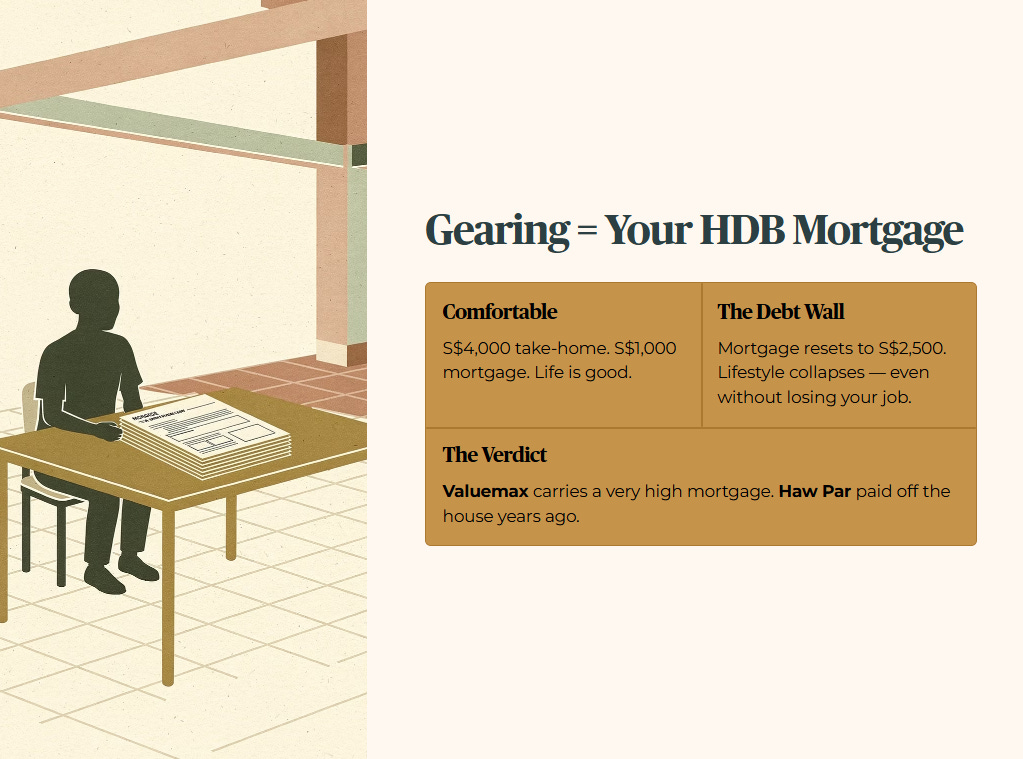 Think of Gearing like the monthly mortgage on your HDB flat. If your take-home pay is S$4,000 and your mortgage is S$1,000, you are comfortably geared. But if your mortgage resets to S$2,500 due to rising ratesâhitting the Debt Wallâyour lifestyle collapses even if you didnât lose your job. Valuemax is carrying a very high mortgage; Haw Par paid off the house years ago.