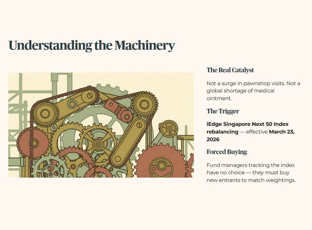 Before we even look at the individual companies, we must understand the machinery of the market. The real catalyst here is not a sudden explosion in pawnshop visits or a sudden global shortage of medical ointment. The trigger is the iEdge Singapore Next 50 Index rebalancing, effective March 23, 2026. When an index rebalances, institutional fund managers who track that index do not have the luxury of choice; they are structurally forced to buy the new entrants to match the index weightings.
