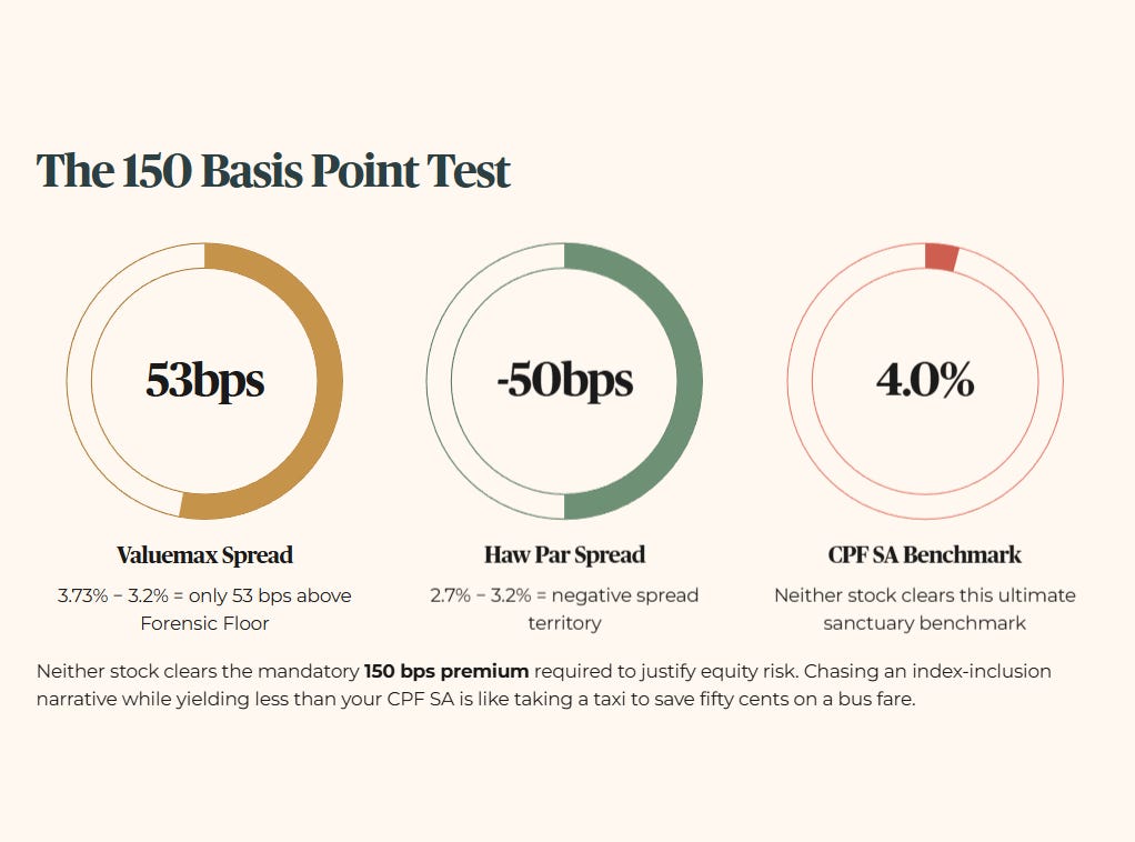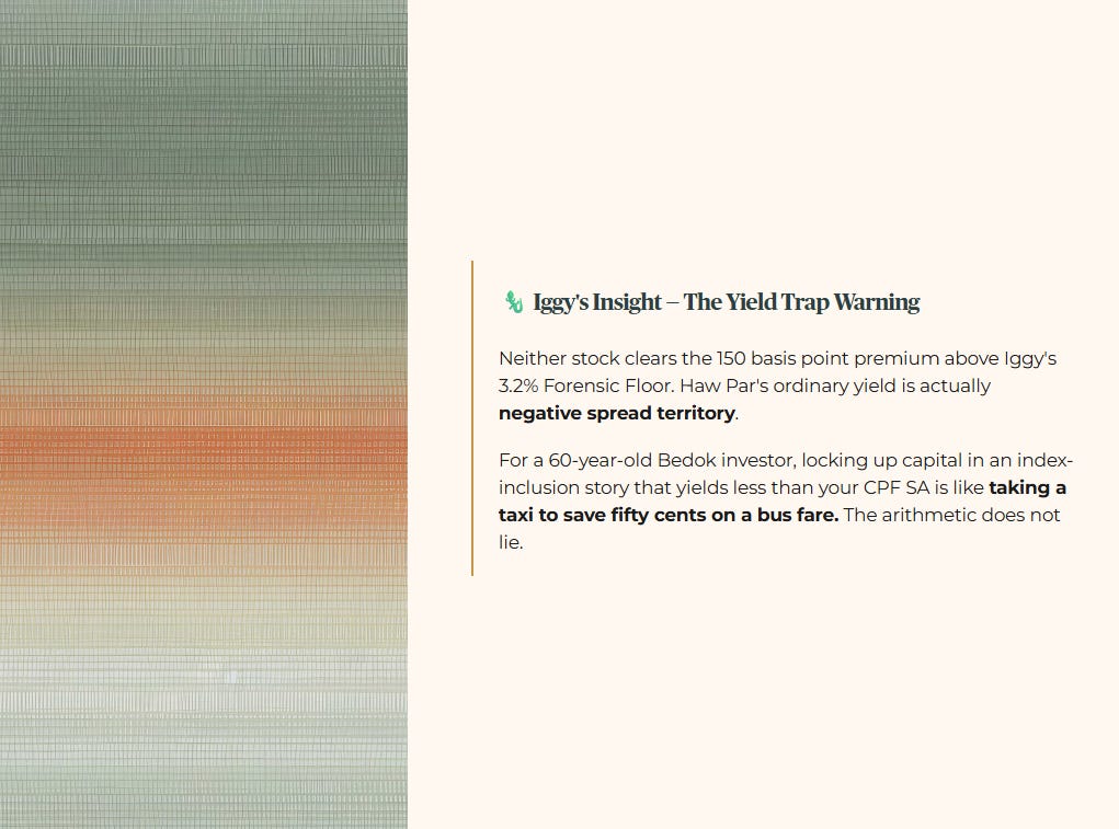 Neither stock clears the 150 basis point premium above Iggyâs 3.2% Forensic Floor. Haw Parâs ordinary yield is actually negative spread territory. For a 60-year-old Bedok investor, locking up capital in an index-inclusion story that yields less than your CPF SA is like taking a taxi to save fifty cents on a bus fare. The arithmetic does not lie. Know what you are actually being paid to take on the risk.