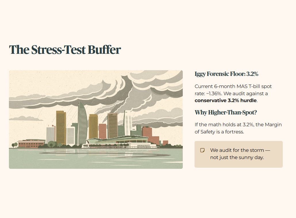 Note on the Stress-Test Buffer: For this audit, I apply a Stress-Test Buffer using a conservative floor of 3.2% as our working ârisk-freeâ benchmark. While the current spot rate for 6-month MAS T-bills is approximately 1.36%, I test the thesis against this âhigher-than-spotâ hurdle. If the math holds at 3.2%, the Margin of Safety at current levels is a fortress. We audit for the storm, not just the sunny day.