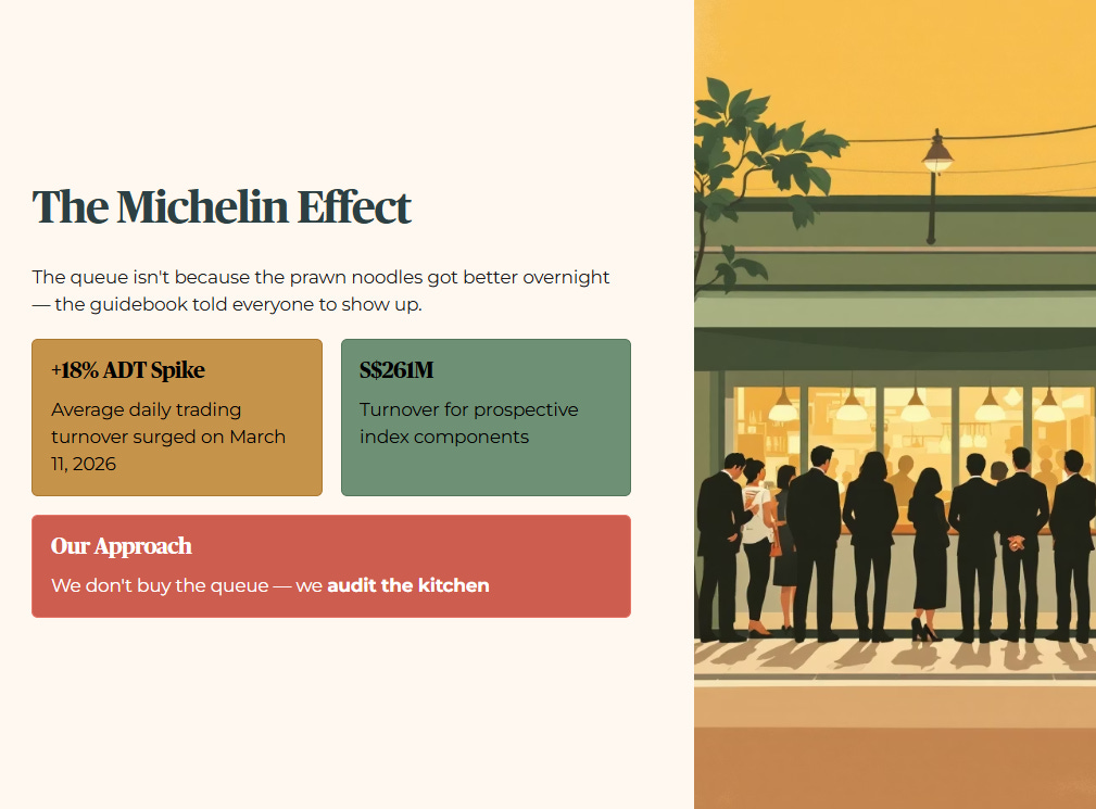 This is the financial equivalent of a neighbourhood kopitiam suddenly being awarded a Michelin Bib Gourmand. The queue that forms the next day isnât necessarily because the prawn noodles got better overnight; it is because the guidebook told everyone to show up. We saw the immediate market reaction on March 11, 2026, when the average daily trading turnover (ADT) for prospective components spiked by 18% to S$261 million. This forced liquidity is what has pushed Valuemax Group Ltd and Haw Par Corporation Ltd into the spotlight. But as forensic investors, we do not buy the queue; we audit the kitchen.