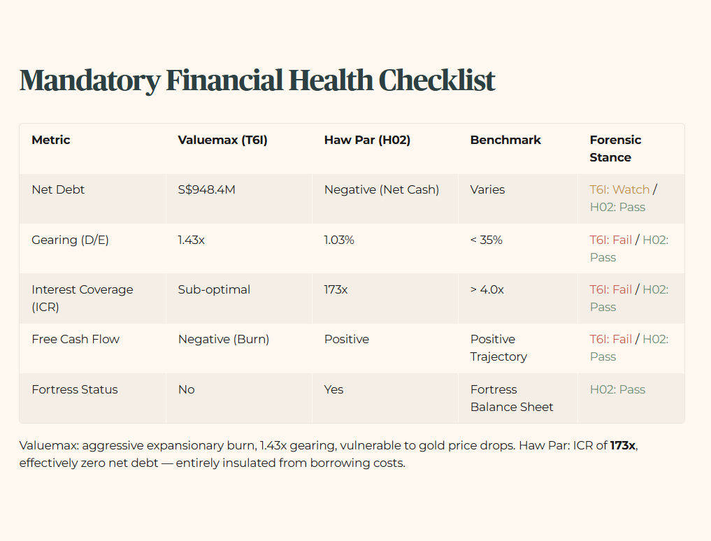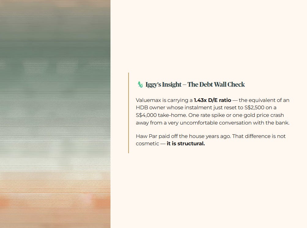 Gearing is just your mortgage in disguise. Valuemax is carrying a 1.43x debt-to-equity ratio â the equivalent of an HDB owner whose monthly instalment just reset to S$2,500 on a S$4,000 take-home. The house isnât on fire yet, but one rate spike or one gold price crash away from a very uncomfortable conversation with the bank. Haw Par paid off the house years ago. That difference is not cosmetic â it is structural.