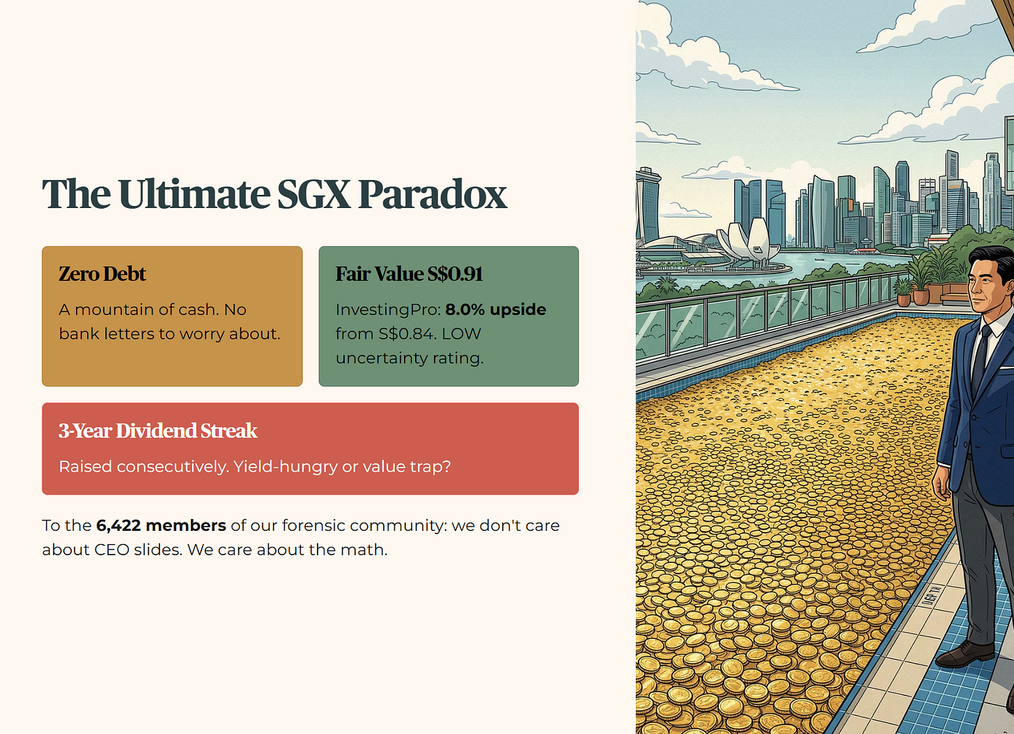 It is the ultimate paradox of the SGX tech sector. You have a company with zero debt and a mountain of cash that could fill an Olympic-sized swimming pool in Toa Payoh. Yet, at S$0.84 , the market treats it like a sunset business waiting for the lights to go out. InvestingPro assigns a LOW uncertainty rating with a Fair Value of S$0.91 âan 8.0% upside. The company has raised its dividend for three consecutive years. Is this a mispriced fortress or a value trap designed to lure in yield-hungry retirees? We are going to look behind the curtain.