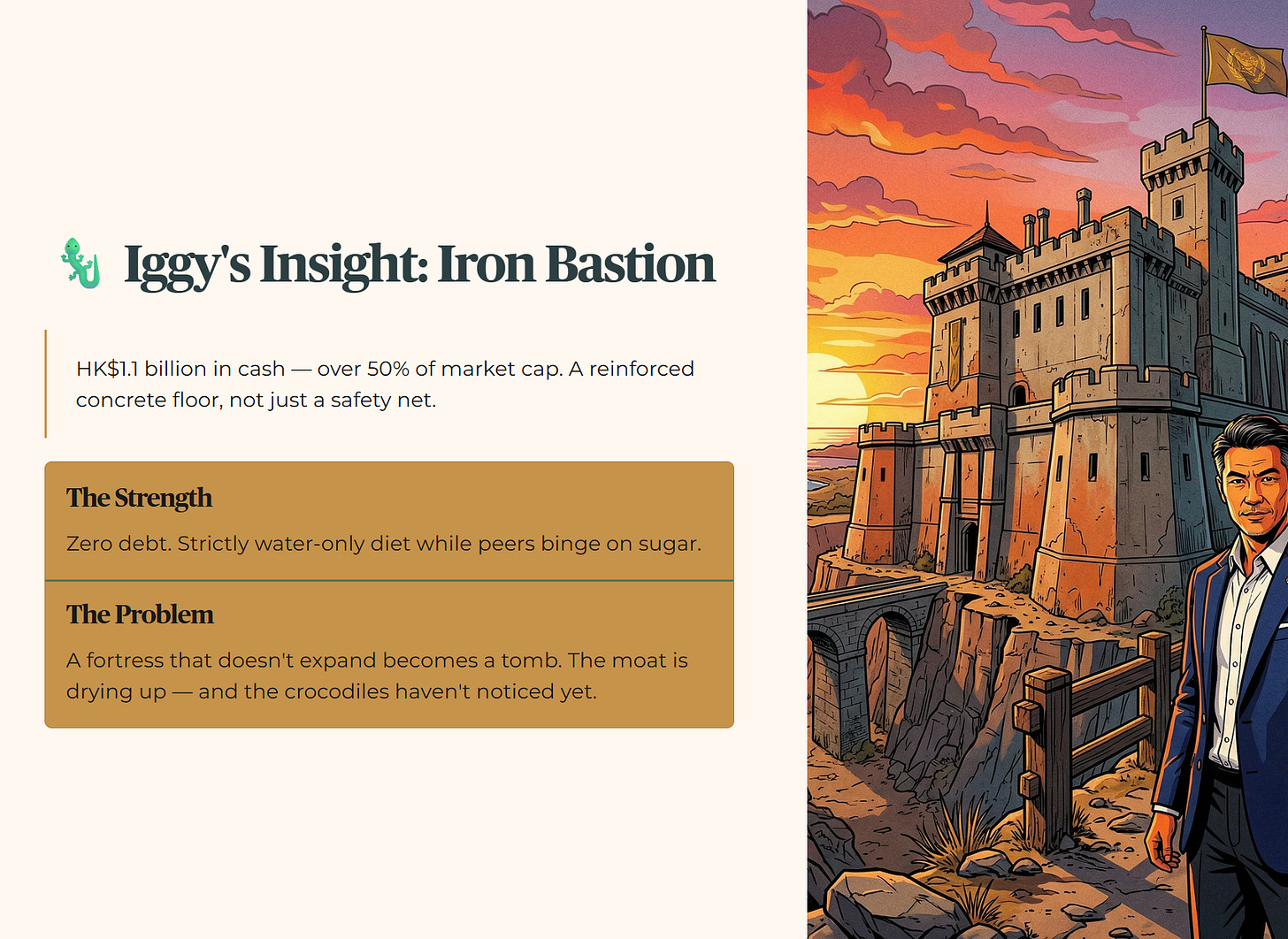 Valuetronics is currently an Iron Bastion. Most companies use debt like a sugary drink to get a temporary energy boost, but BN2 is strictly on a water-only diet. They are sitting on HK$1.1 billion in cash, which represents over 50% of their market cap . This isnât just a safety net; itâs a reinforced concrete floor. But here is the problem: a fortress that doesnât expand eventually becomes a tomb. The management is sitting on so much cash they could buy a small town, yet they are barely growing the top line. The fortress is standing, but the moat is drying upâand the crocodiles have not noticed yet.