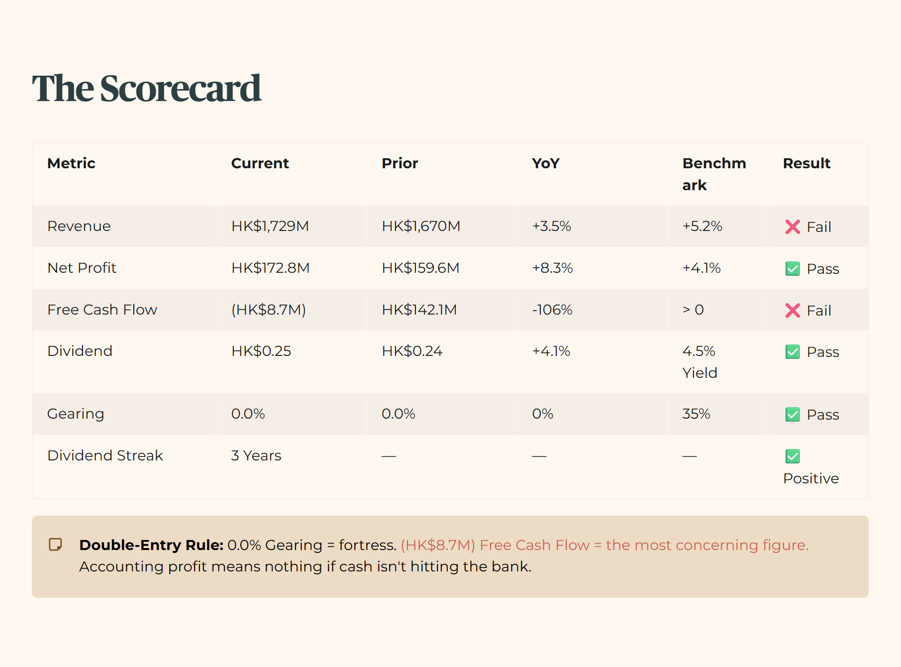 The Double-Entry Rule: The figure that most encourages a forensic stance is the 0.0% Gearing. In a world where interest rates are a permanent headache, being debt-free is like owning your HDB outright without a mortgageâyou just donât worry about the bankâs next letter. However, the most concerning figure is the (HK$8.7M) Free Cash Flow. It doesnât matter how high your âaccounting profitâ is if the cash isnât actually hitting the bank account at the end of the day .