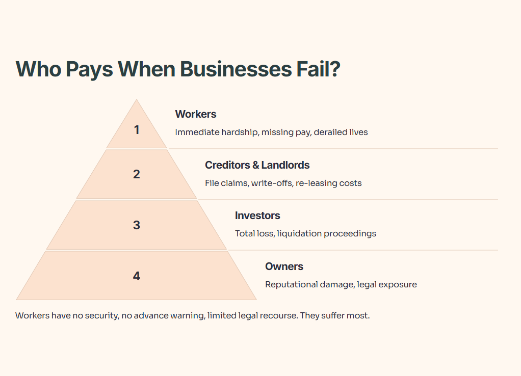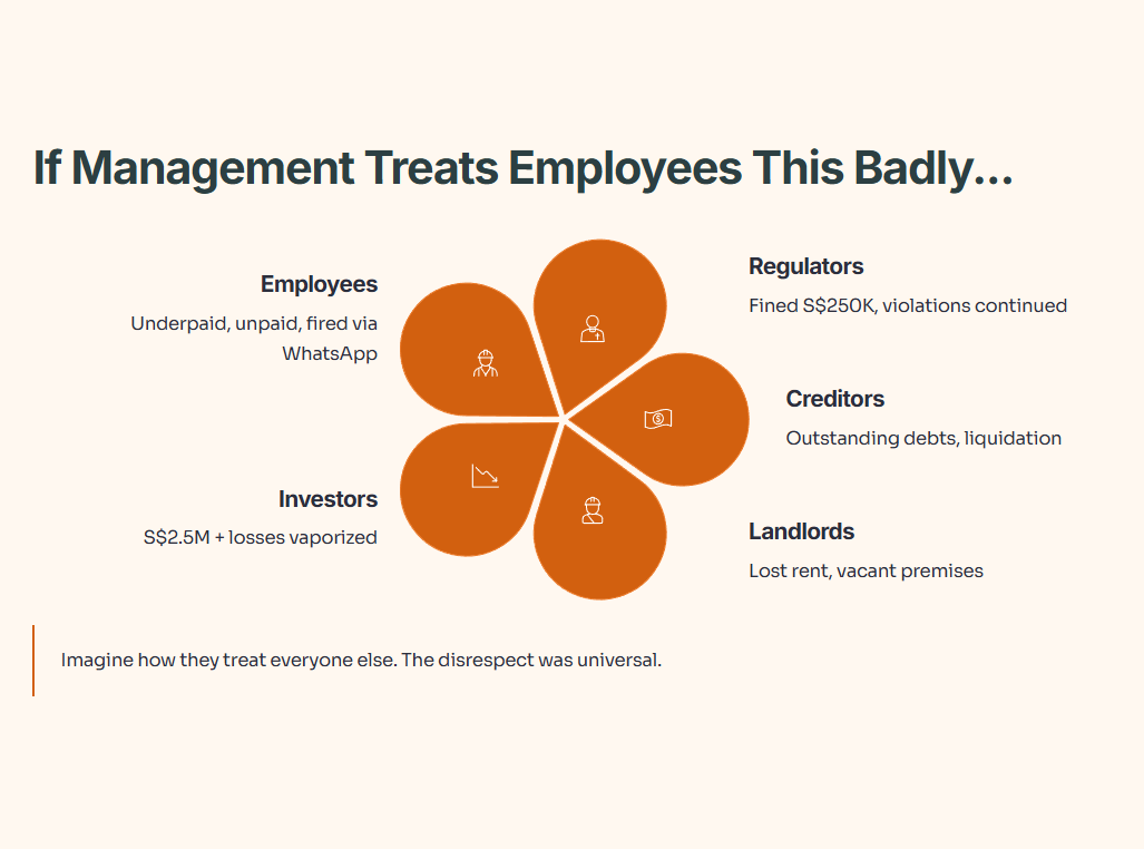 The Reality Check: When businesses fail, workers suffer most. They have no security, no advance warning, and limited legal recourse. Creditors file claims. Landlords find new tenants. Investors write off losses. But workers face immediate financial hardship. Missing salaries and CPF contributions can derail lives.